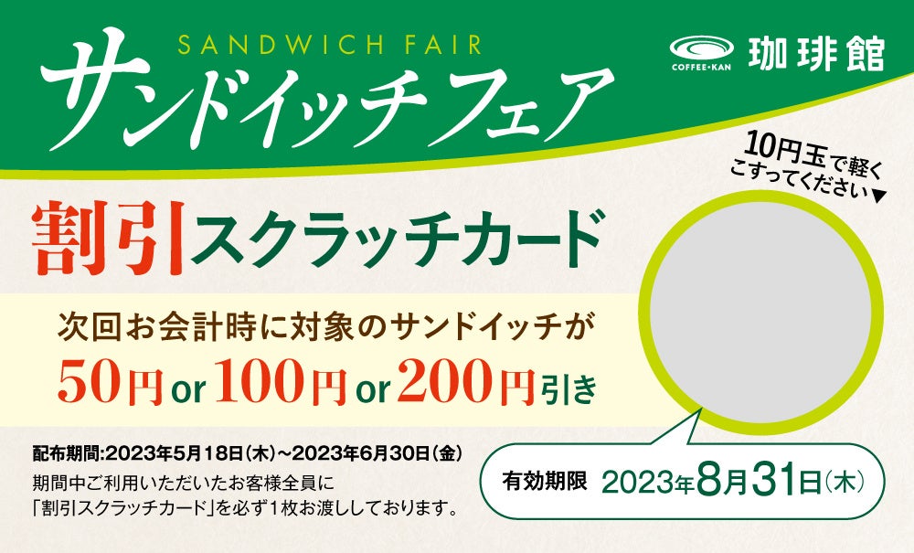 最大200円引き︕お会計ごとに割引スクラッチカードが必ずもらえる『珈琲館』、『珈琲館 蔵』でお得な「サンドイッチフェア」を5月18日(木)より開催︕