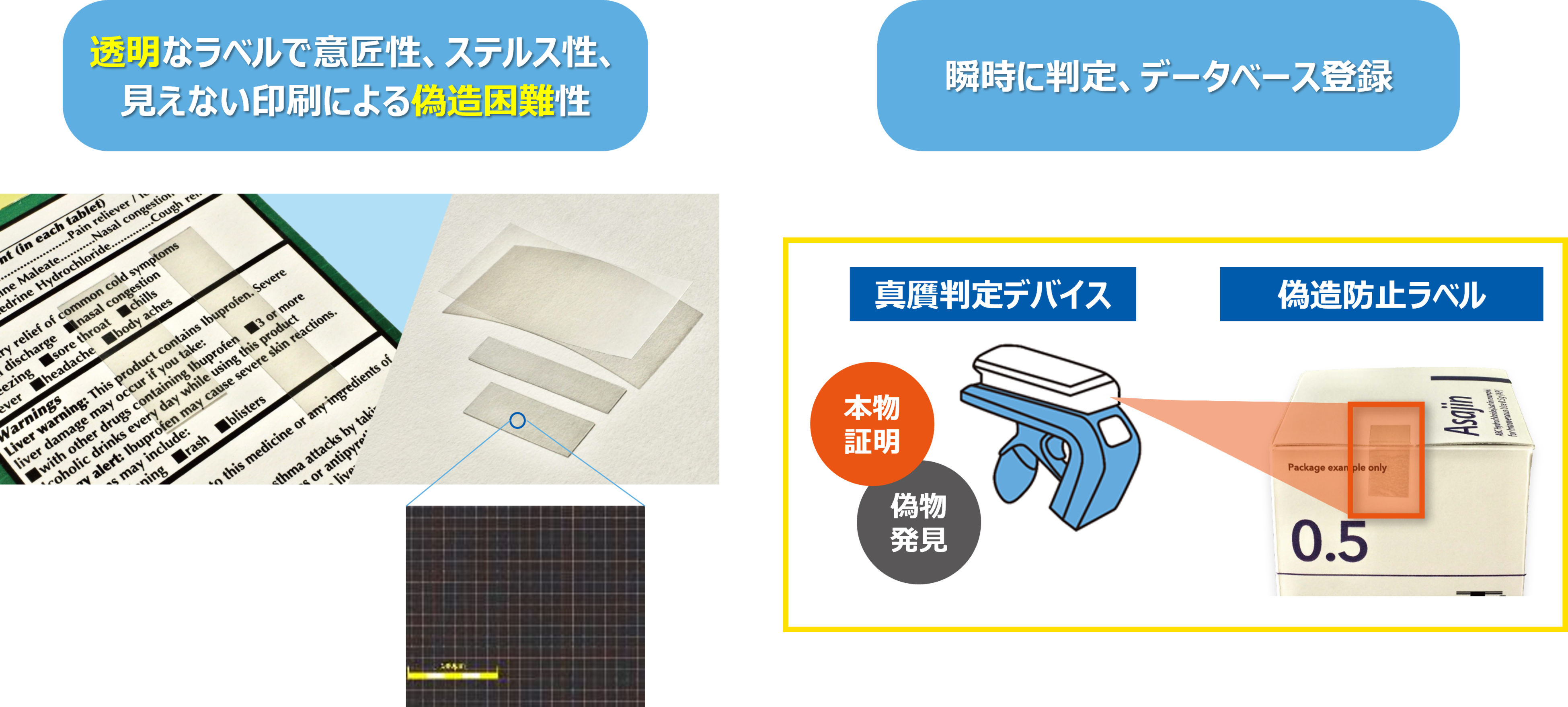 偽造防止ラベルは旭化成独自の材料と技術を用いて製造された透明なラベルで、サブミクロン(1ミクロン以下)解像度の特殊パターンが印刷されています。旭化成はこの非常に微細なパターンの形成に成功し、これまで様々な国際学会で発表を行っています。
