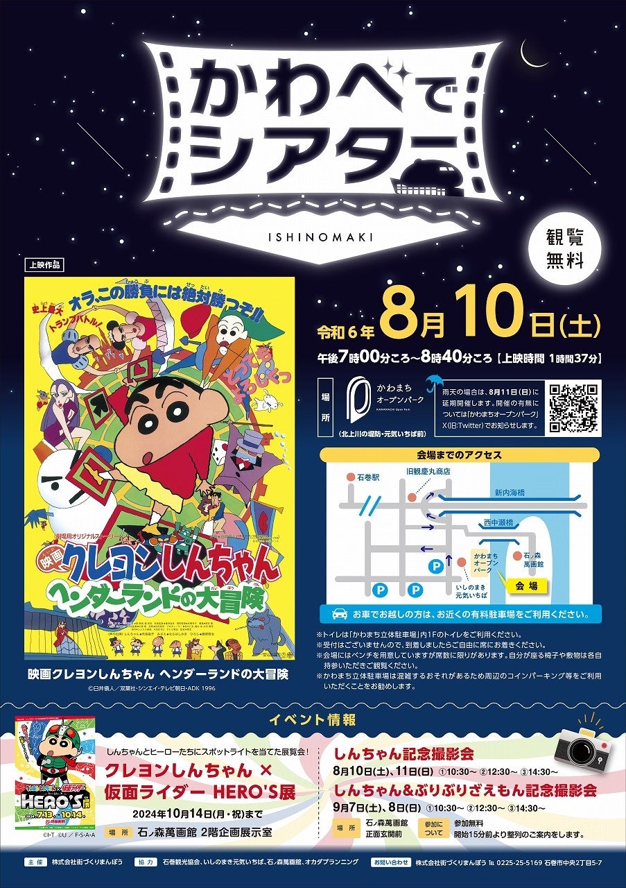 8/10(土)萬画館をスクリーンにした野外上映会は「クレヨンしんちゃんヘンダーランドの大冒険」を上映します!!【宮城県石巻市】