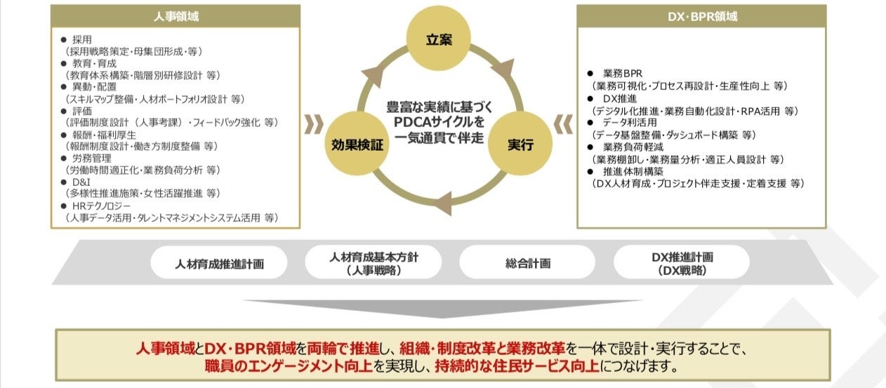 自治体の「人材育成基本方針(人事戦略)」と「DX推進計画(DX戦略)」を連結させ、職員の業務負荷軽減とやりがい向上を同時に実現することで、持続的な住民サービスの向上へとつなげます。