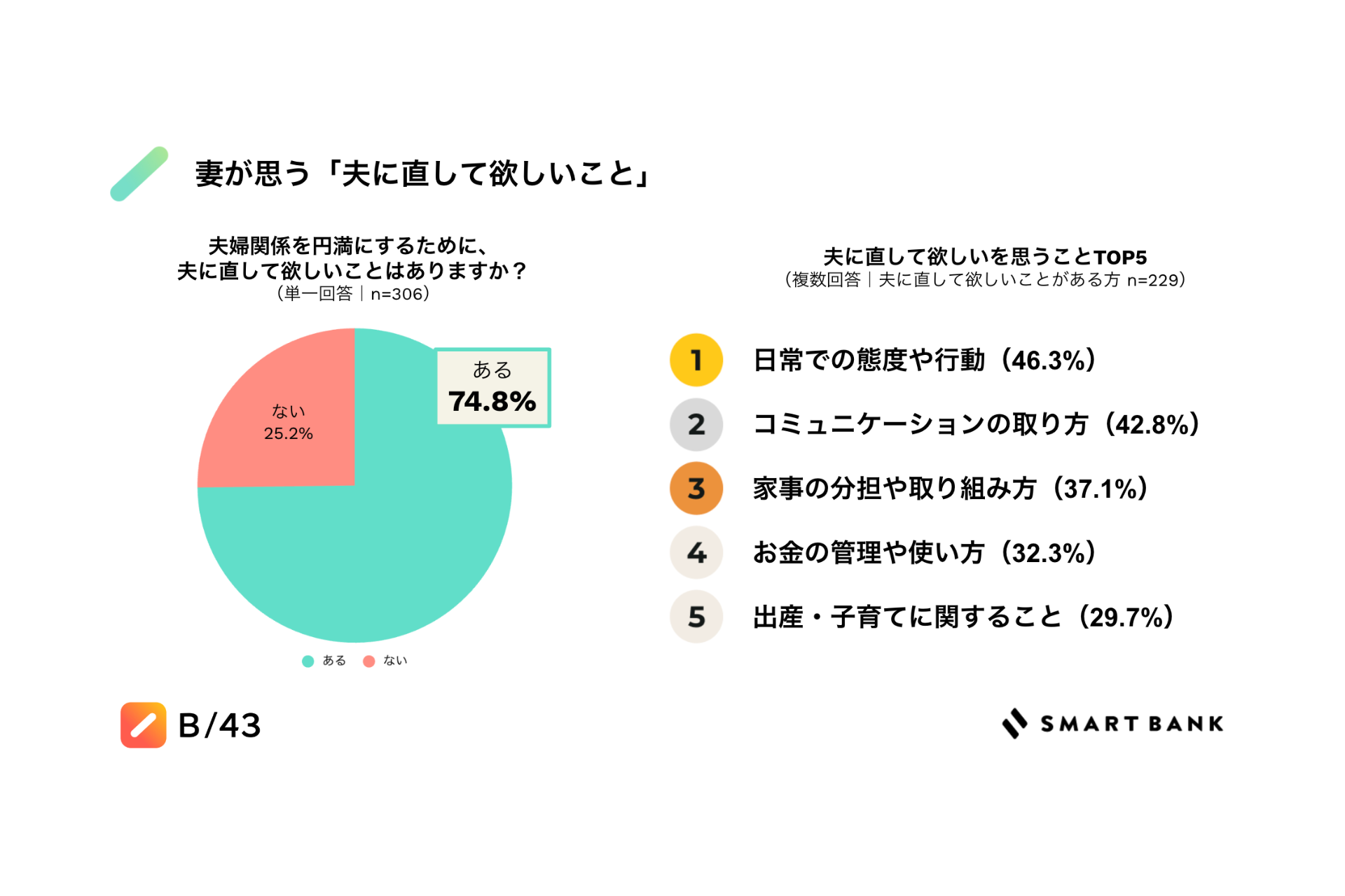 既婚女性に対し、夫婦関係を円満にするために夫に直して欲しいことがあるかを質問したところ、74.8%が「ある」、25.2%が「ない」と回答しました。また、具体的に直して欲しいと思うこととして最も多い回答は「日常での態度や行動」(46.3%)となりました。