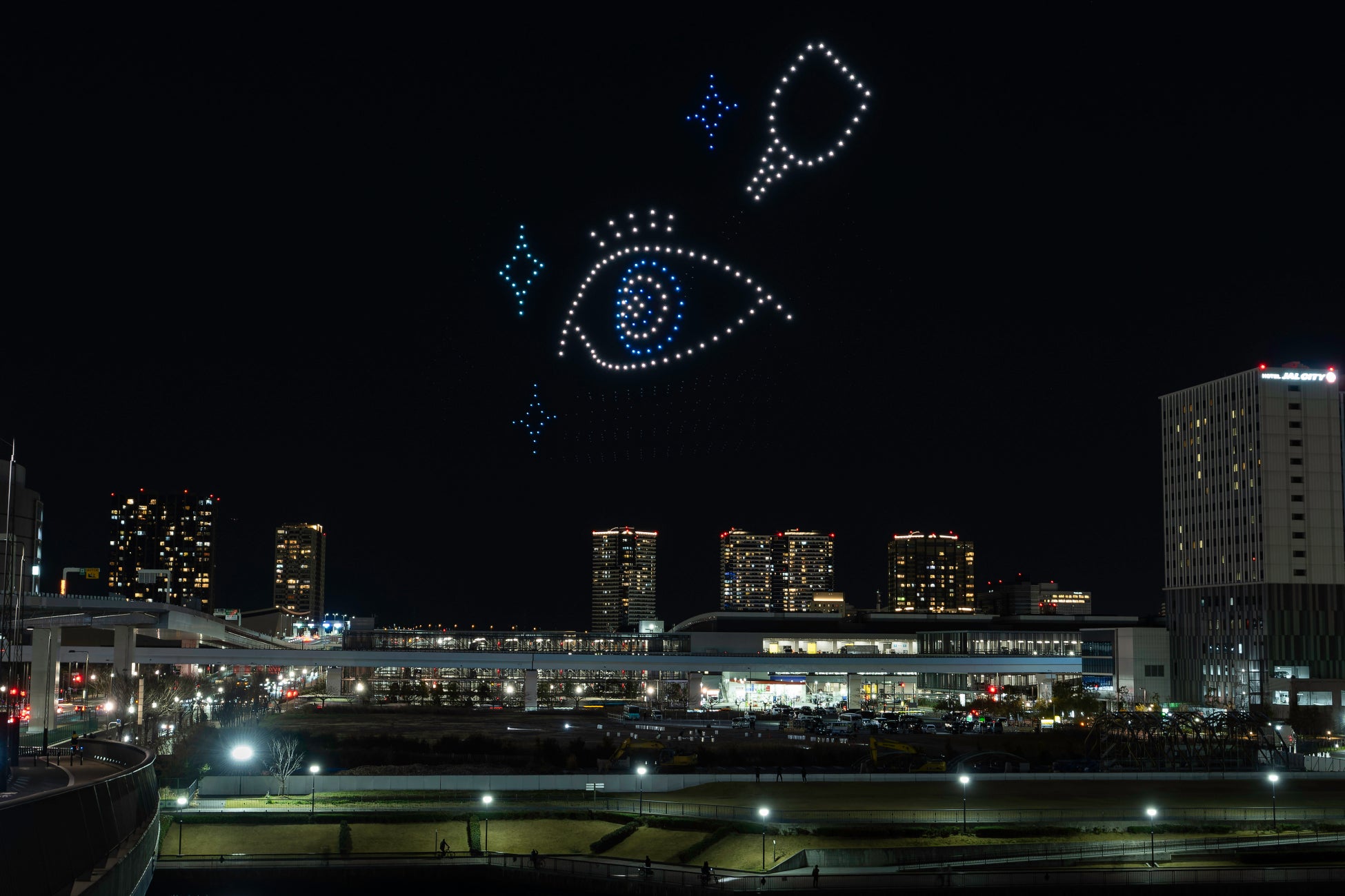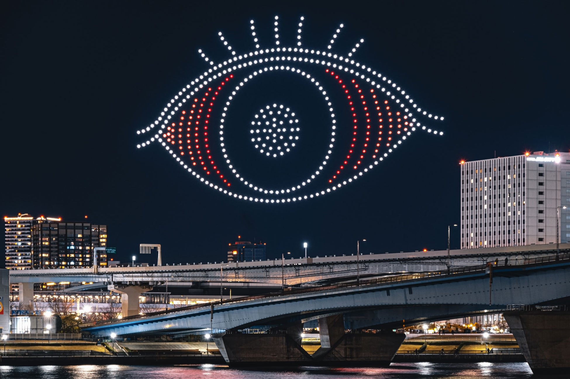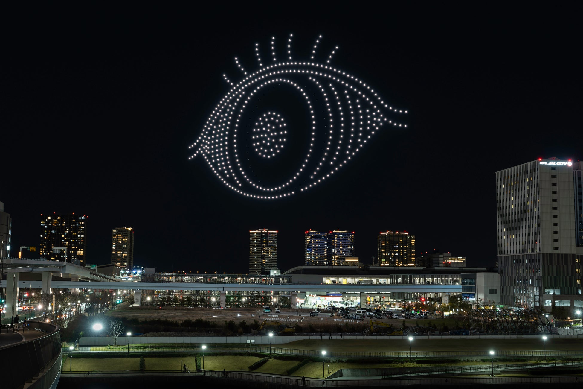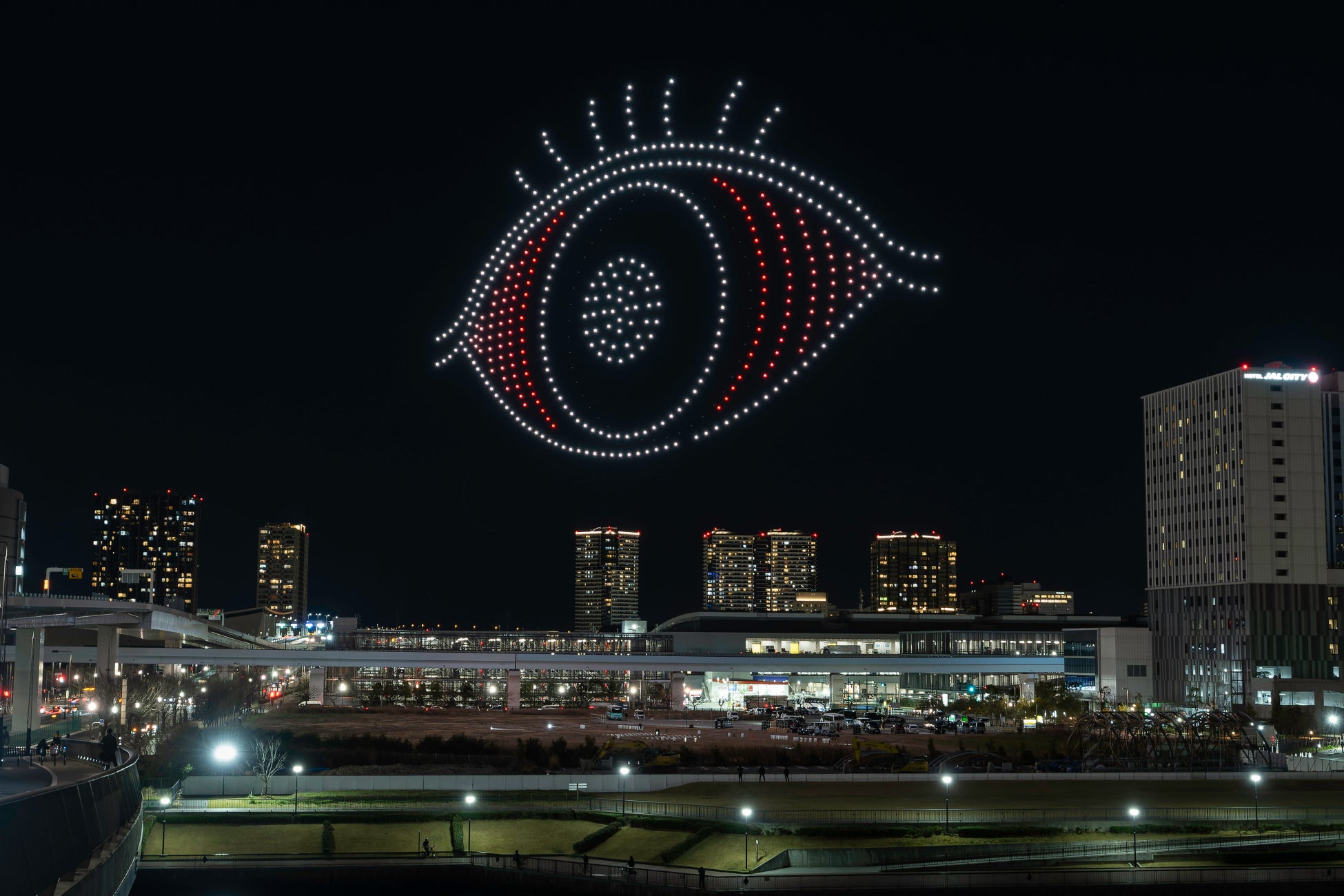 ドローンショー「目の愛護ショー in TOKYO」を豊洲で実施!大阪で話題となった100m超えの巨大な目や「ハト、ハト・・・」の演出が再び。