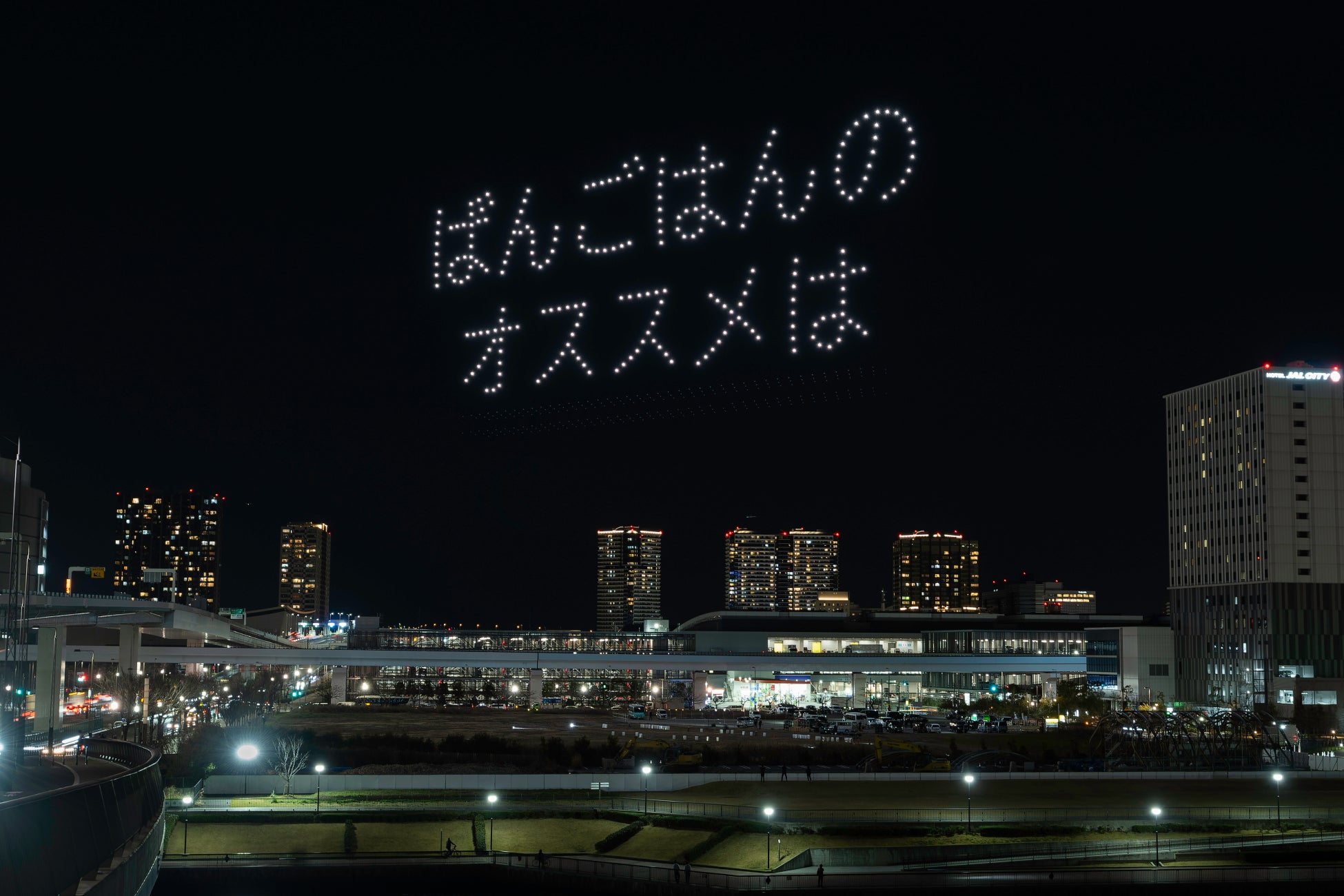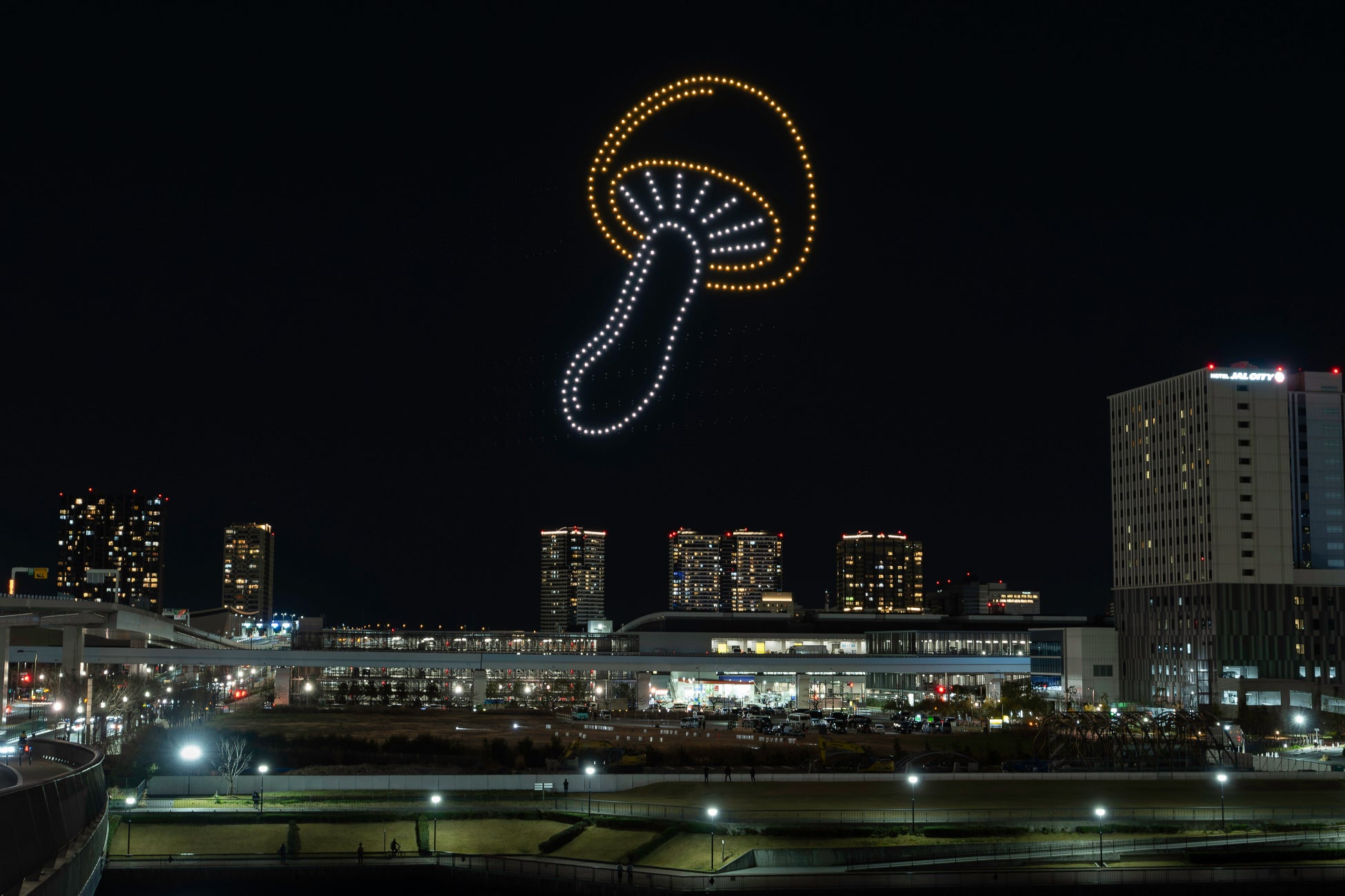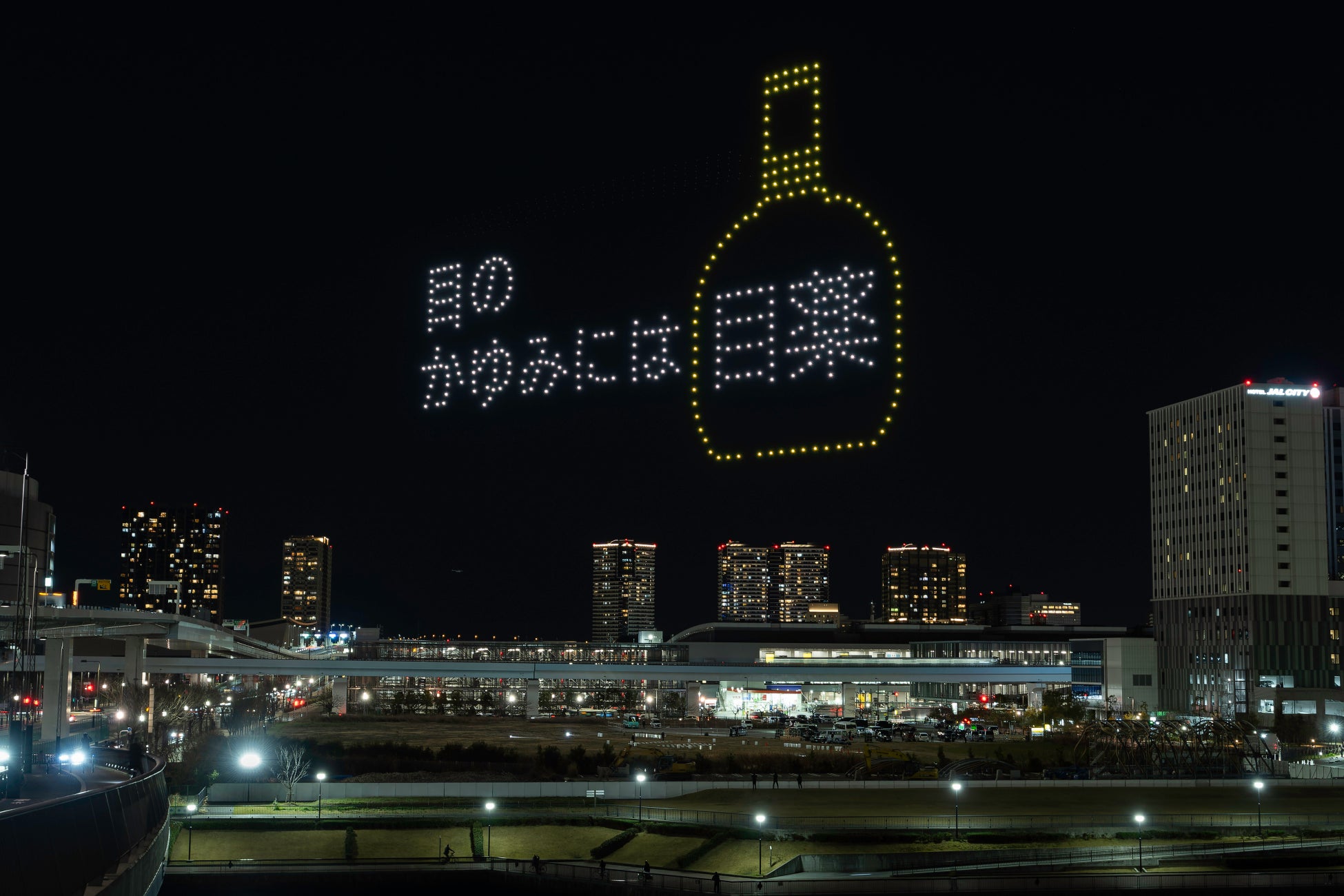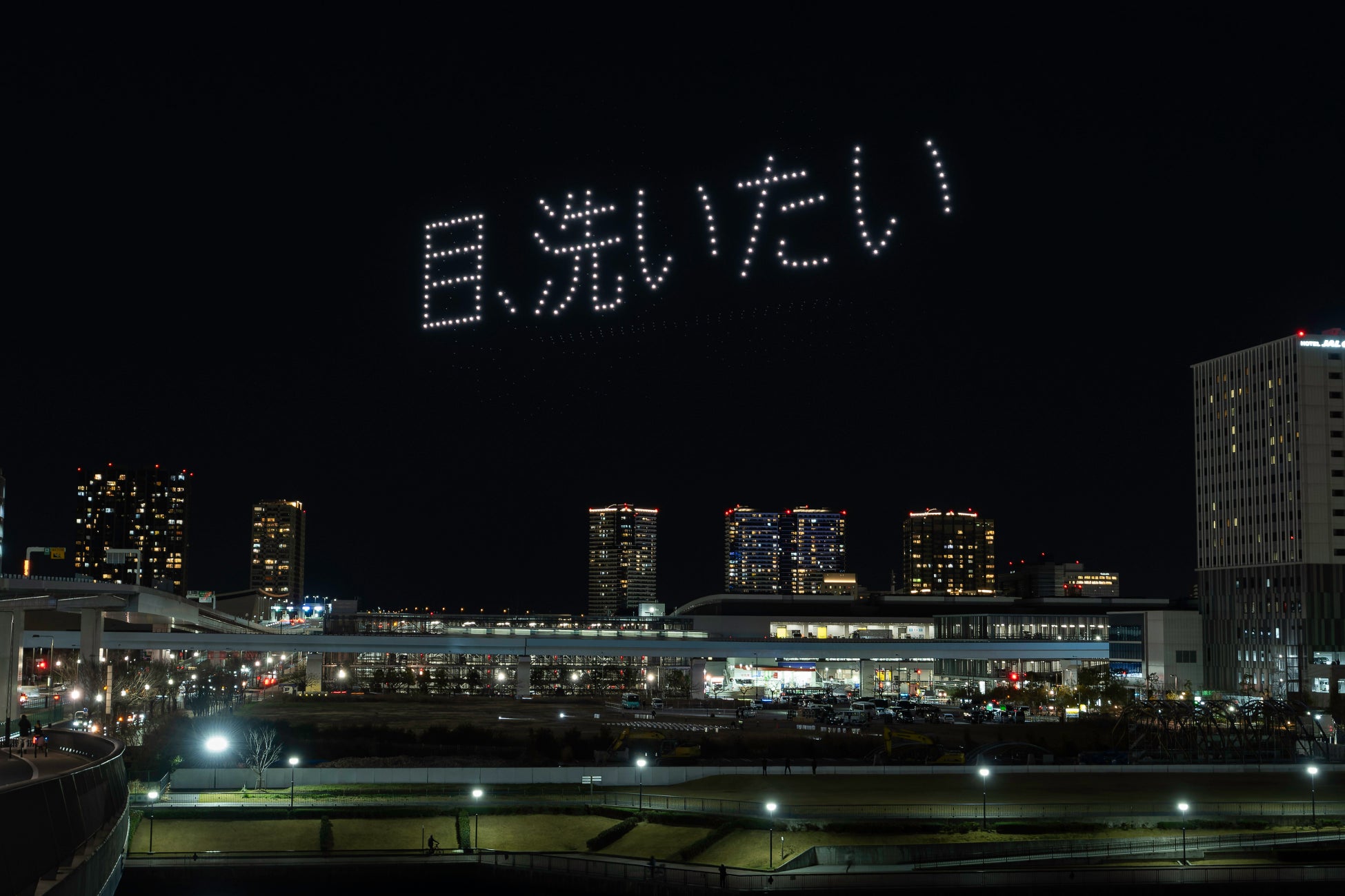 こちらはロート製薬株式会社(本社:大阪府大阪市、社長:杉本雅史)制作による、花粉飛散時期に、目の健康を意識するきっかけを提供するドローンショーで、500機のドローンが幅100メートルを超える巨大な目を描いたり、花粉症対策として目のケアをする目薬やオススメのごはん等が、夜空をユーモアに彩りました。