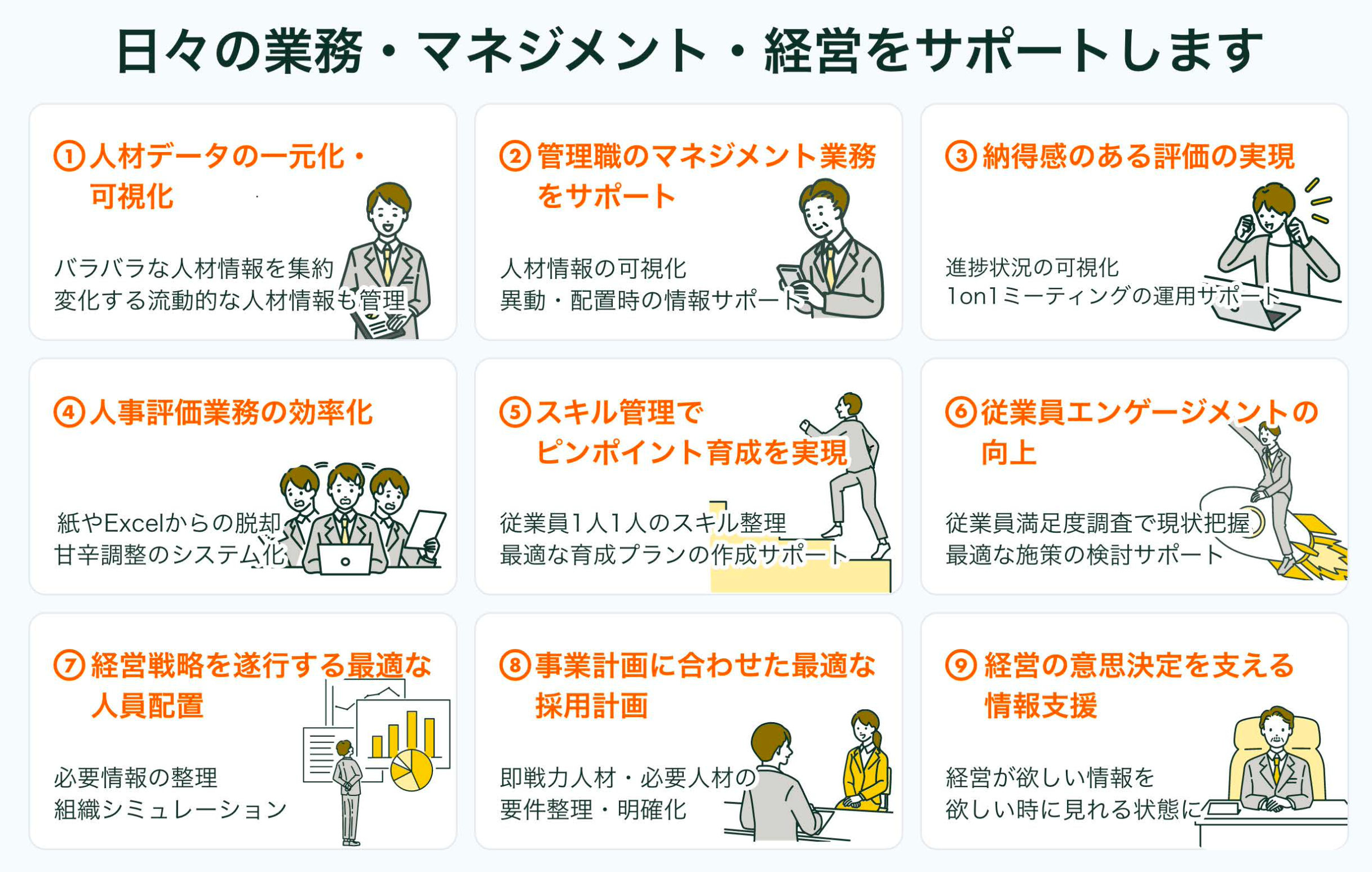 組織内に分散しがちな人材情報や目標を一元管理して見える化し、従業員の経歴やスキルを瞬時に把握できます。また、人材育成や人材配置、目標の設定、採用計画、人事制度運用の効率化、離職防止などをさまざまな機能でサポートします。