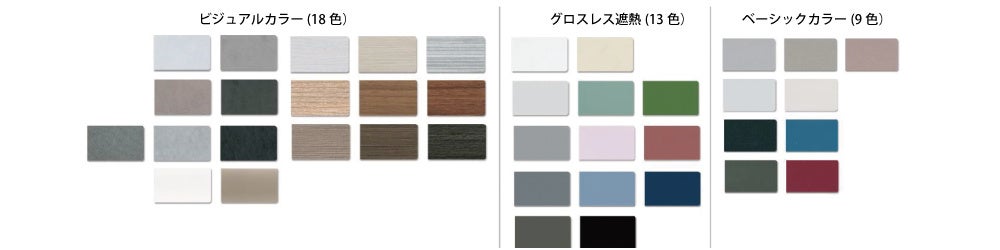 人気の木目調に加え、新たに石目調や金属調などを拡充した「ビジュアルカラー」、遮熱性能に優れ、マットな質感が魅力の「グロスレス遮熱」、アルミの質感を活かしたハイグロスな「ベーシックカラー」を全40色ラインナップいたします。