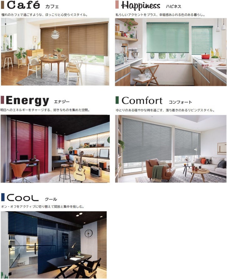 デザインブラインド『アフタービート』を使う時に感じる「感情」をモチーフに、「カフェ」「ハピネス」「エナジー」「コンフォート」「クール」の5つのフィーリングテーマでカラーラインナップを展開します。各テーマは、キッチン家電やインテリアなどとコーディネートがしやすく、住宅・非住宅どちらにも選びやすい色彩です。