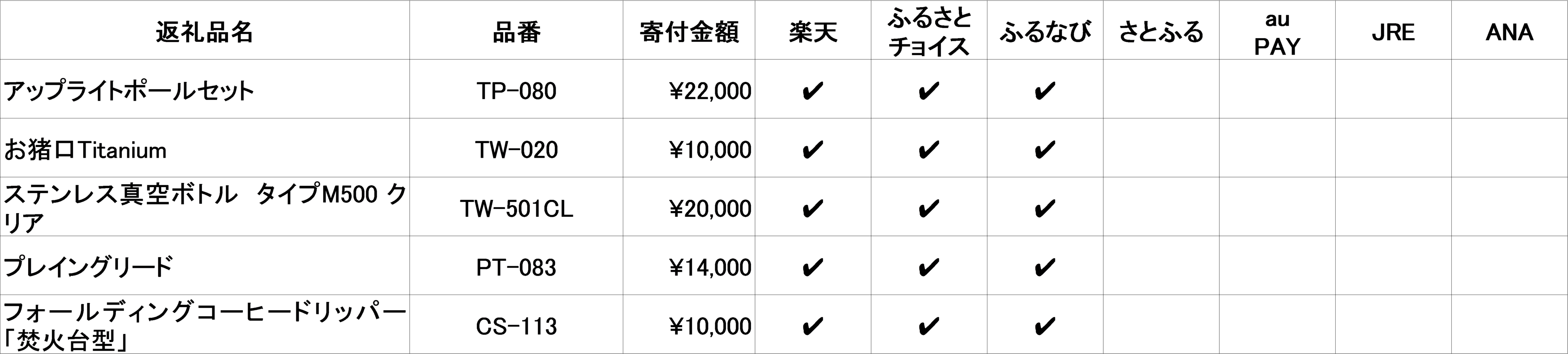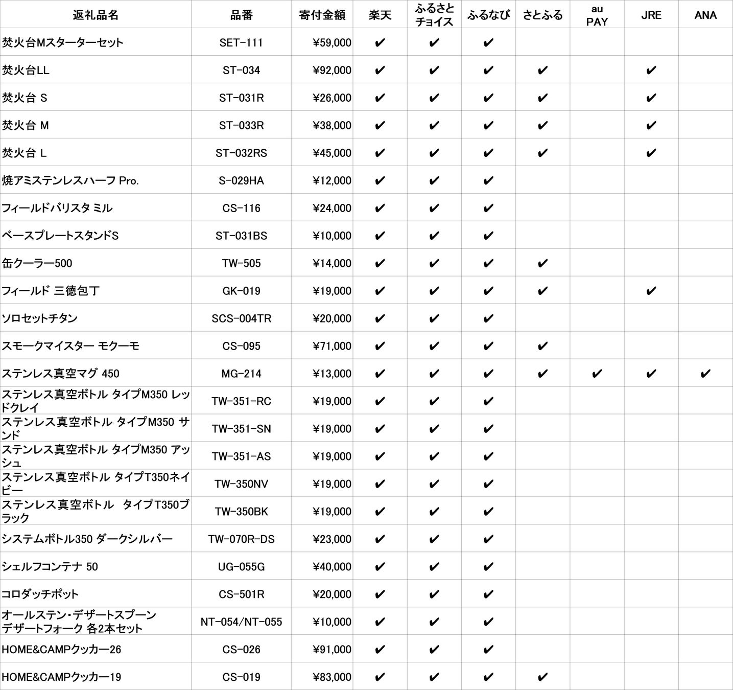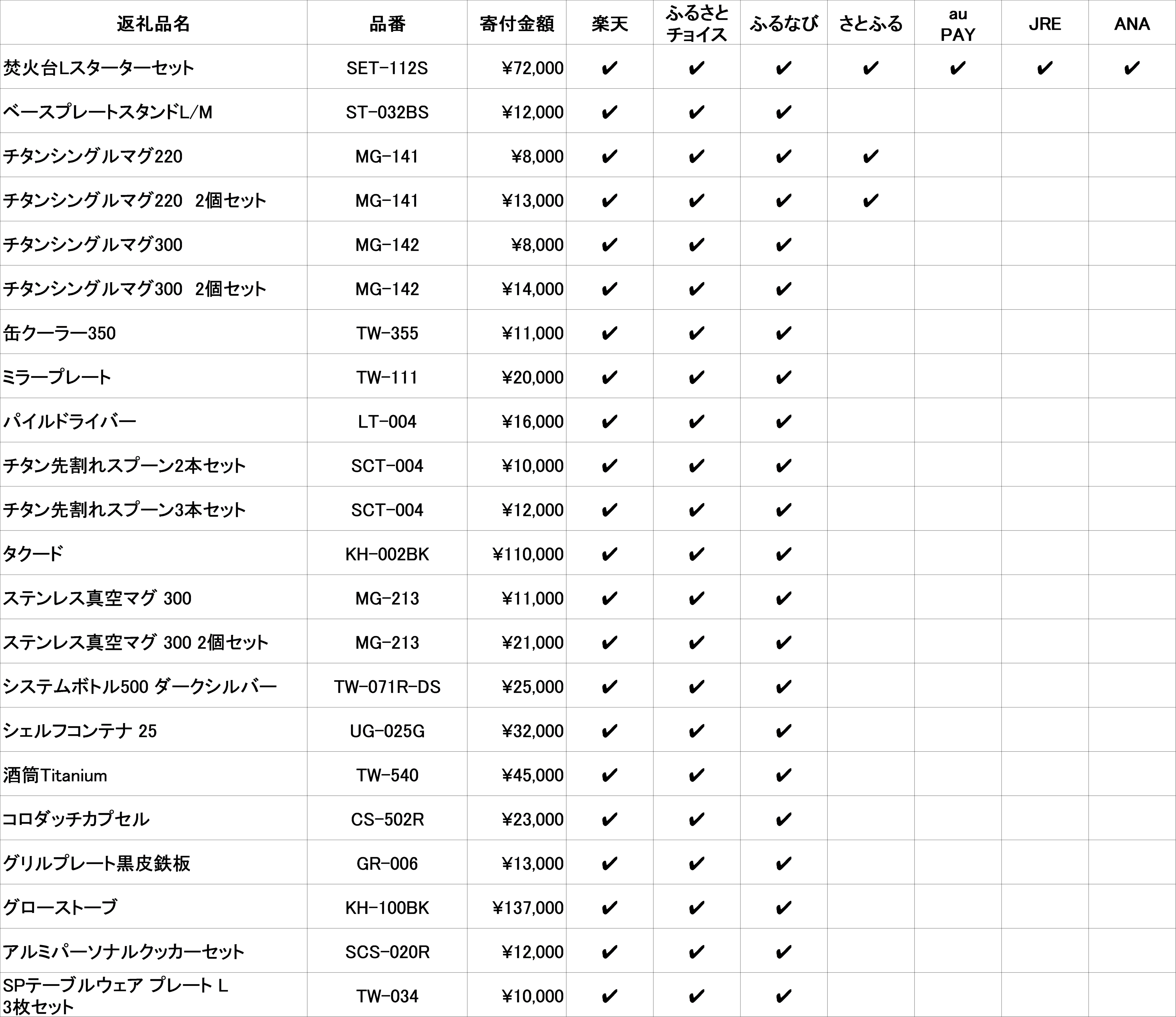 楽天ふるさと納税、ふるさとチョイス、ふるなび、さとふる、JRE MALL ふるさと納税、au PAYふるさと納税、ANAのふるさと納税にて出品の予定です。(別表参照)