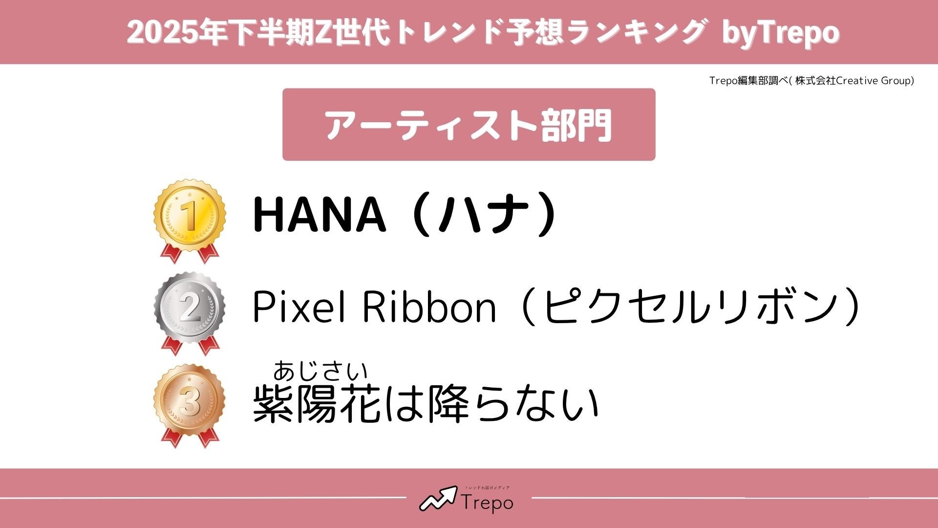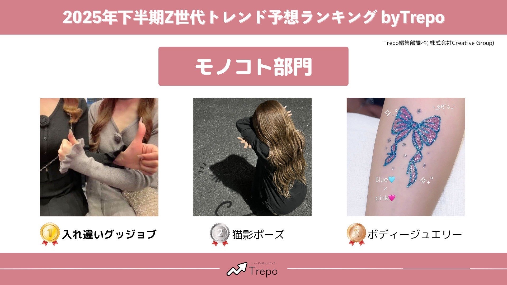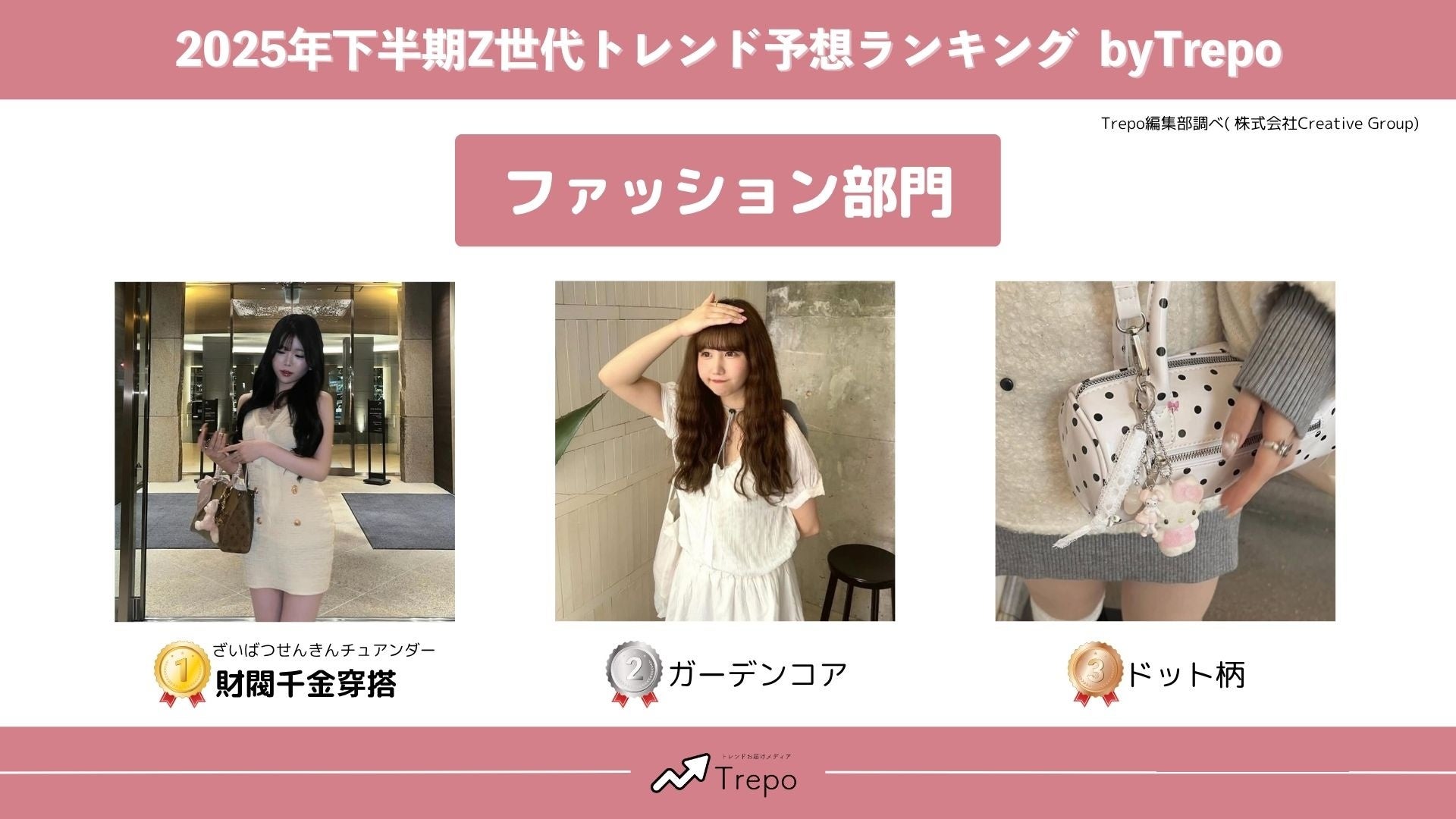 株式会社Creative Group(本社:東京都千代田区、代表取締役:中原一真)が運営する10代~20代女性向けトレンドメディア『Trepo(トレポ)』は、10代~20代の女性(Trepo girls)を対象に、2025年下半期のZ世代トレンド予想調査を行いました。WEBで実施したアンケート調査(以降「Trepo girls調査」)の結果をお知らせします。