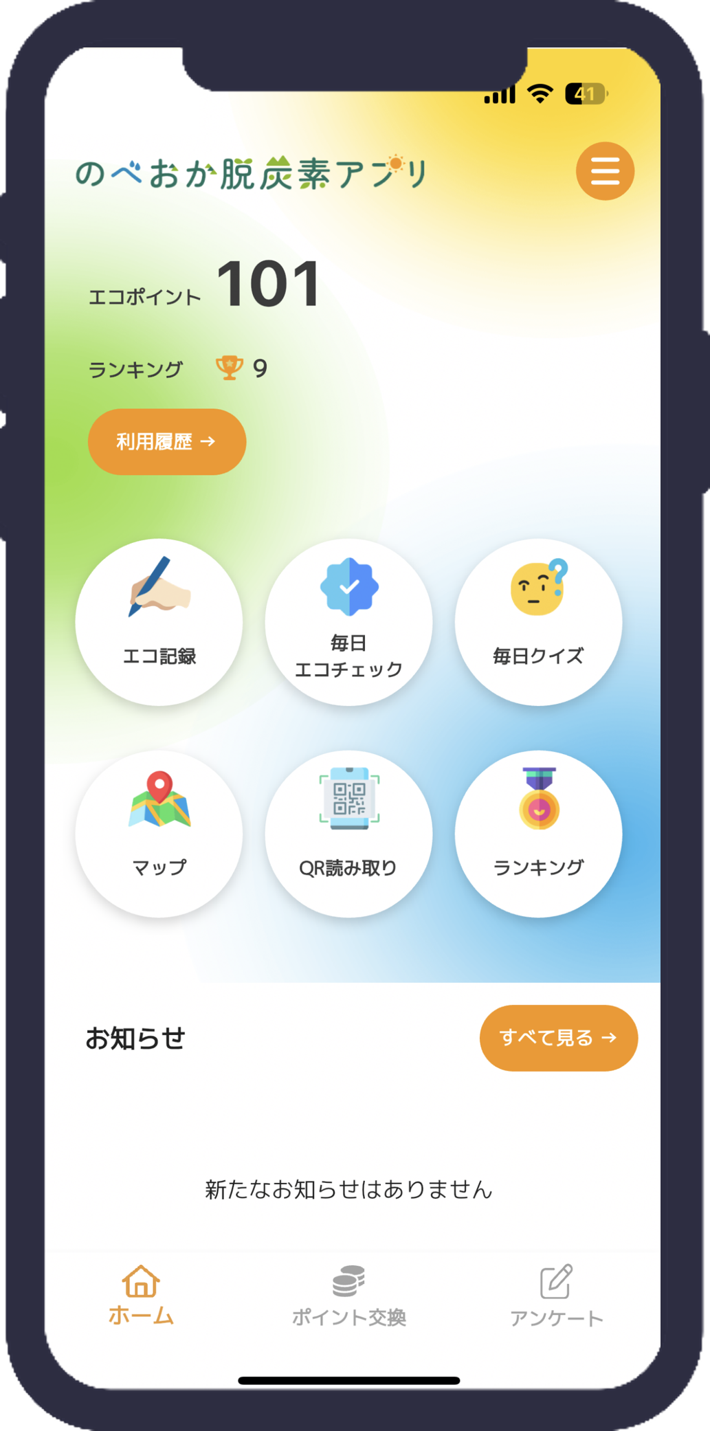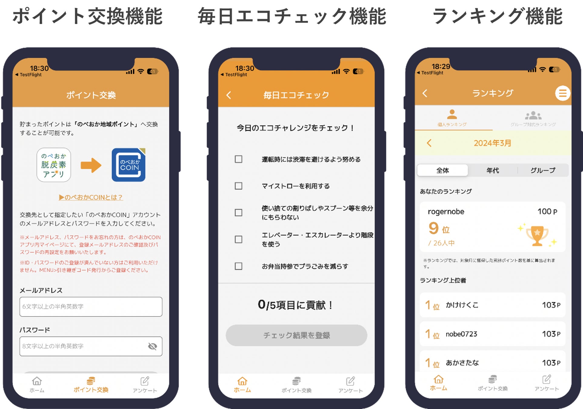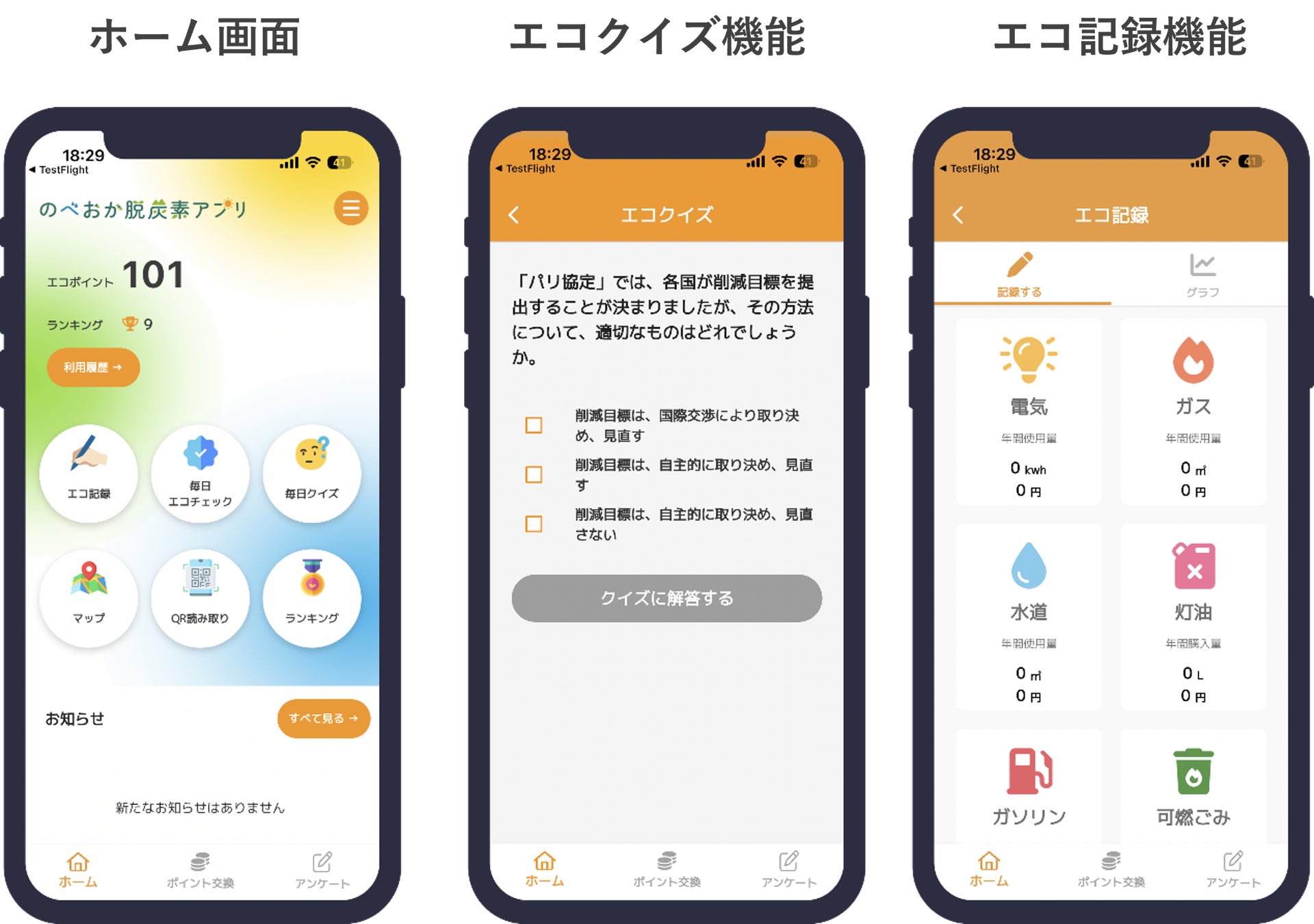 アプリを通じて地域全体の脱炭素化を推進し、「ゼロカーボンシティのべおか」の実現に貢献してまいります。