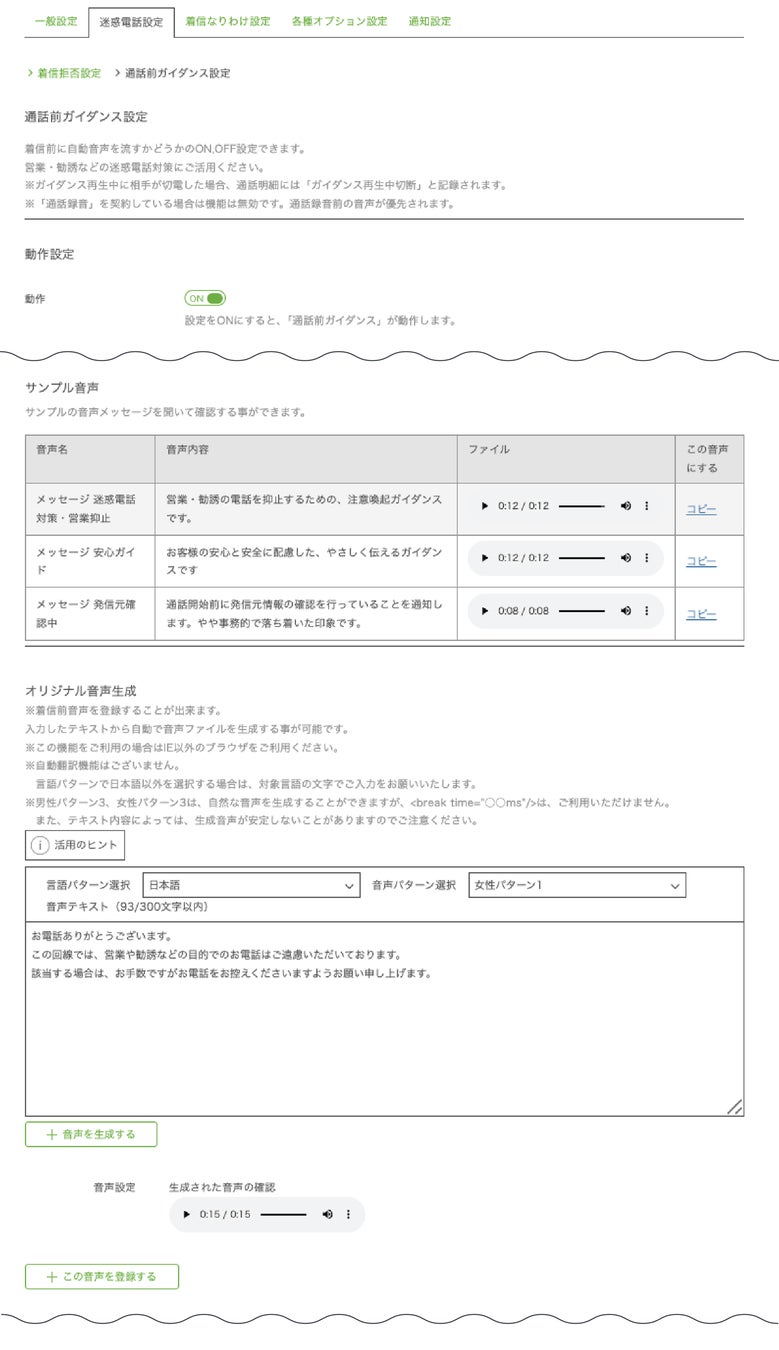 本機能は2025年4月17日よりすべてのユーザーに無償提供されており、設定はお客様ページから簡単にON/OFFが可能です。音声はサンプルの音声か、テキストからお好みのメッセージを設定可能です。