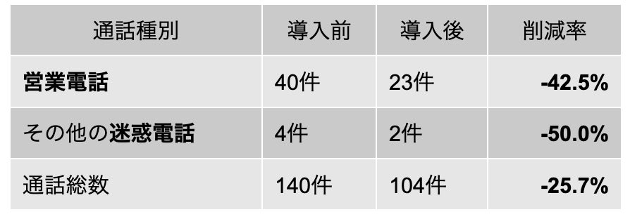 営業電話およびその他の迷惑電話の合計件数は、導入前が44件、導入後は25件。