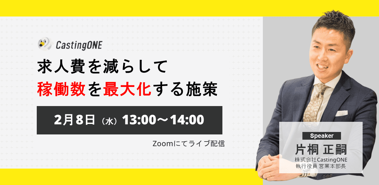 株式会社CastingONE(キャスティングワン、本社:東京都渋谷区、代表取締役:野澤 怜司)は、無料ウェビナー「求人費を減らして『稼働数を最大化する』施策とは」を開催致します。