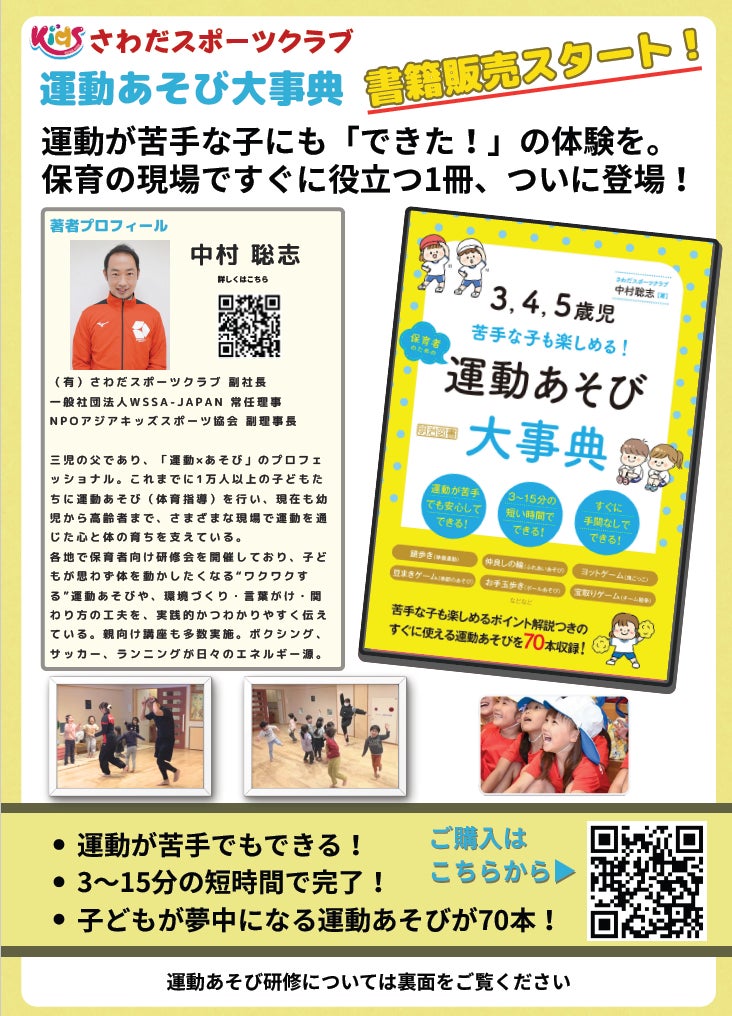 この度、子どもたちの健やかな成長を願い都内50か所の保育園・幼稚園での運動あそびを展開する、有限会社さわだスポーツクラブ(本社:東京都練馬、取締役社長:澤田 康徳、以下さわだSC)は、こどもの発育発達に寄り添った運動遊びの指導ノウハウを詰め込んだ書籍『3,4,5歳児 苦手な子も楽しめる!保育者のための運動あそび大事典(明治図書出版)』を2025年6月27日に刊行しました。