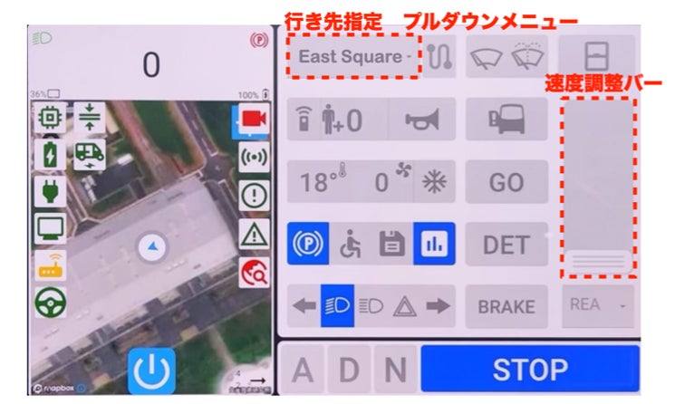 「MiCa」の車内にはシンプルなインターフェースを搭載した操作用のタブレットが備えられており、画面上のプルダウンメニューから行き先を選択して速度調整バーを上げるだけで、自動運転による走行を開始できます。走行中は速度調整バーを上下させることで任意の速度に変更することができるなど、簡単な操作で自動運転バスの運行に関する業務を行うことができ、今後これらの業務を担っていく地域の交通事業者にとっても、使いやすいインターフェースとなっています。