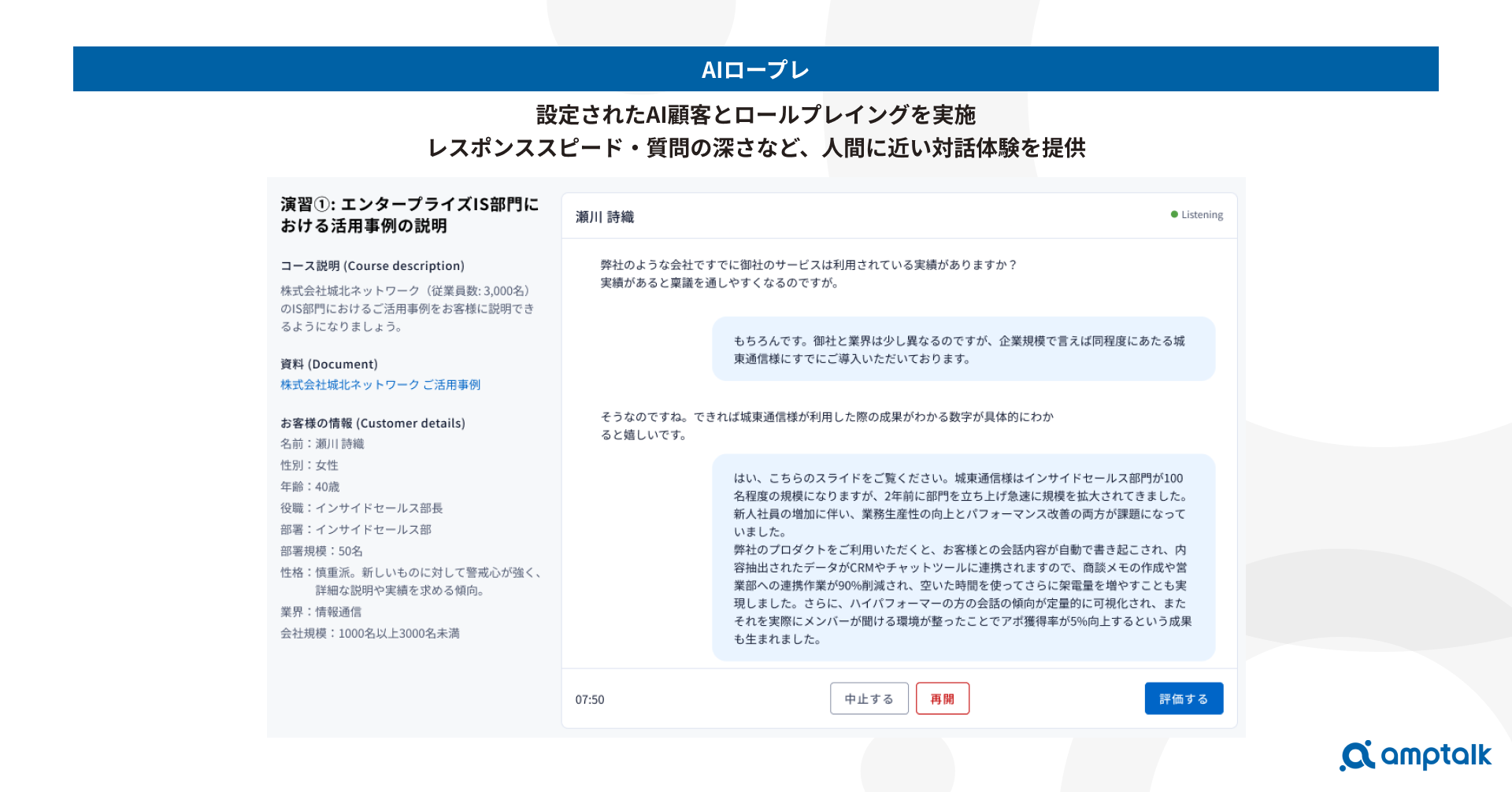 「amptalk coach」は、実際の営業現場で活用されている資料・トークスクリプト・事例などをAIにインプットし、トレーニング相手として設定することができます。営業担当者は、想定顧客のペルソナや商談シナリオに応じて、AIとリアルな対話形式で商談ロールプレイングを行うことが可能です。