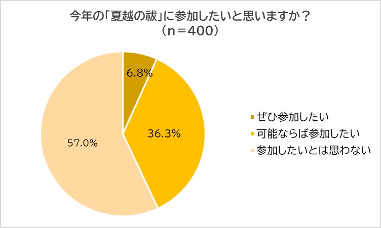 次に、「今年の『夏越の祓』に参加したいと思うか?」と尋ねました。「ぜひ参加したい」(6.8%)、「可能ならば参加したい」(36.3%)を合わせて43.1%の人が前向きな意向を示しました。これにより、認知や経験は少ないながらも、参加への関心は一定数あることが伺えます。