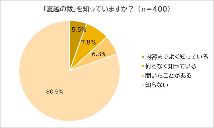 「『夏越の祓』を知っているか?」と尋ねたところ、「内容までよく知っている」と答えたのはわずか5.5%、「何となく知っている」(7.8%)、「聞いたことがある」(6.3%)を合わせても、認知層は全体の19.5%にとどまり、「知らない」と答えた人が80.5%を占めました。