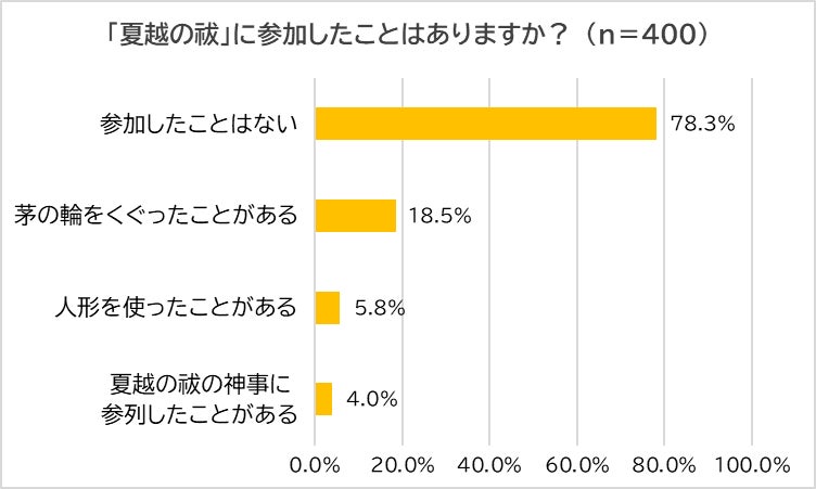 続いて、「『夏越の祓』に参加したことはあるか?」と尋ねたところ、「参加したことはない」と答えた人が78.3%と大多数を占めました。一方で、「茅の輪(ちのわ)をくぐったことがある」(18.5%)、「人形(ひとがた)を使ったことがある」(5.8%)、「夏越の祓の神事に参加したことがある」(4.0%)と多少の経験者も見られました。