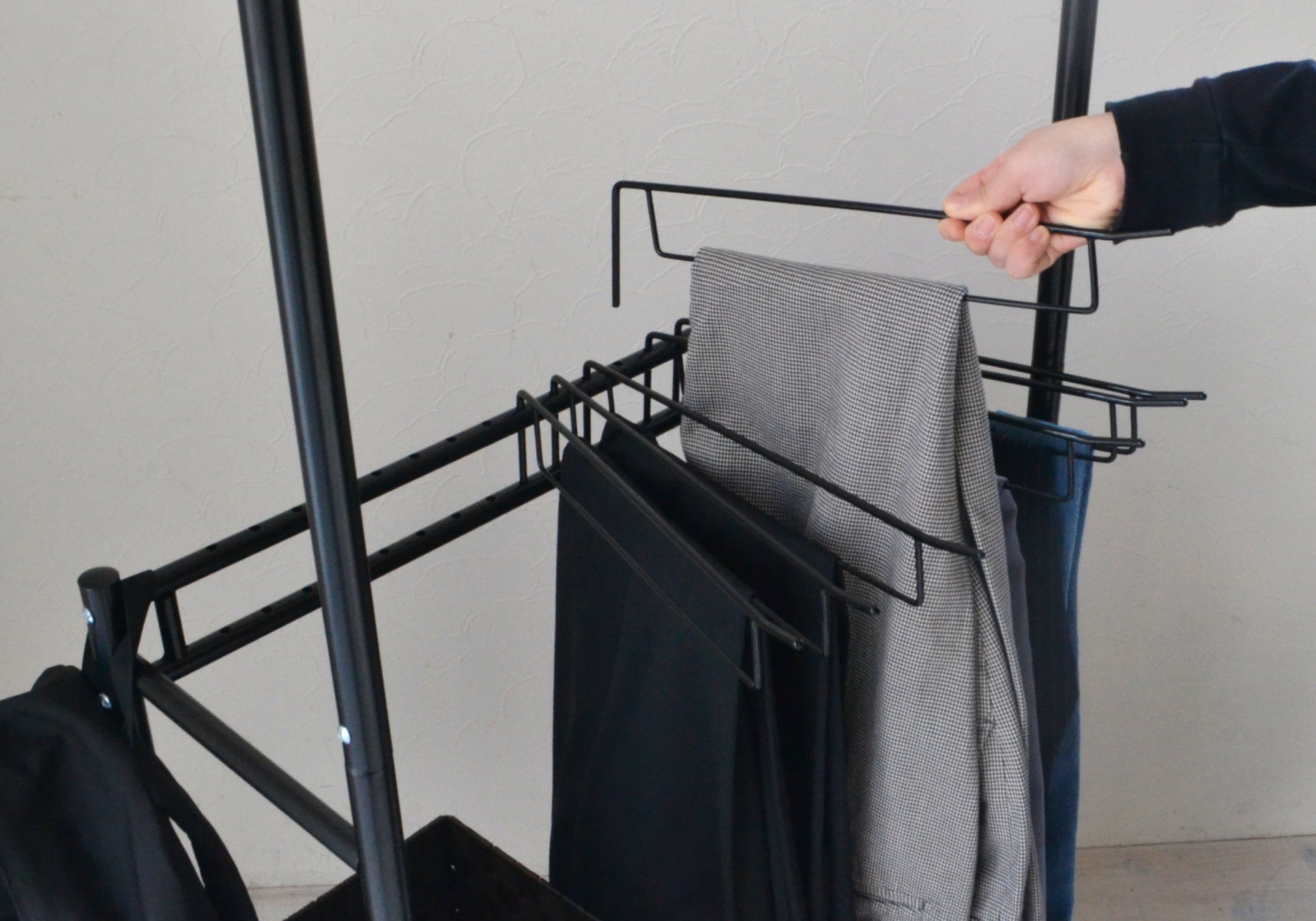 ボトムス収納には弊社の大人気商品「スラックスハンガー」の仕組みを採用。ボトムスをハンガーに掛けて収納できるため、畳みシワになりにくく、チェスト収納に比べて探しやすく取り出しやすくなりました。