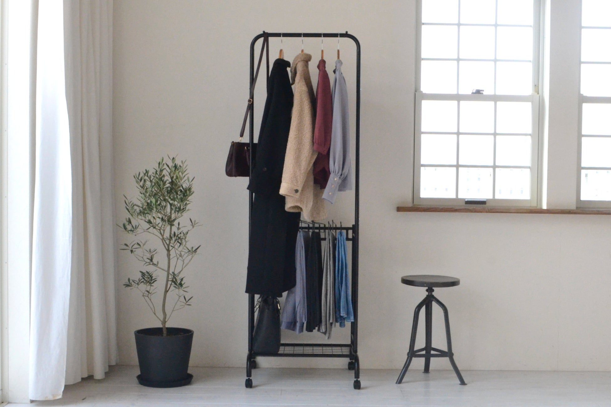 当製品の収納目安は、上部ハンガーパイプ約9着(コート含め)、ボトムスハンガーは7本まで収納可能。一週間分のコーディネートを完成させることができます。