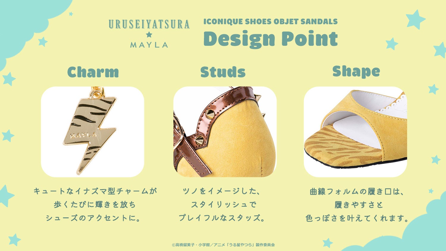 「体温が2℃ あがる」のキャッチコピーでファッションを展開するブランドMAYLAは、『うる星やつら』アイコニック シューズオブジェ サンダルの販売を2023年3月31日(金)18:00より開始いたしました。