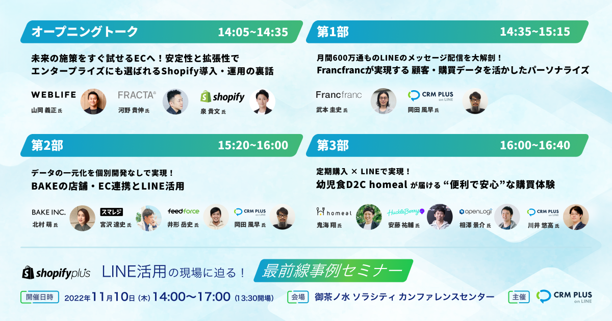 2022年11月10日(木)に開催する「Shopify Plus - LINE活用の現場に迫る!最前線事例セミナー」(主催:株式会社ソーシャルPLUS)にあたり、登壇内容の続報をお知らせします。