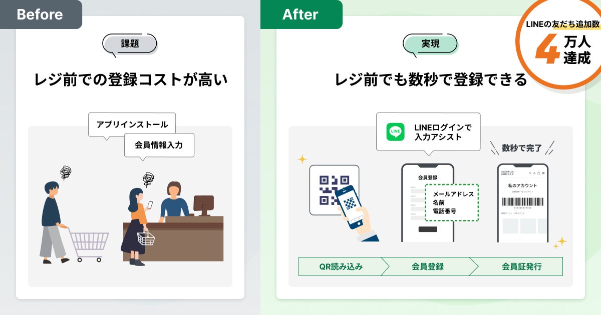 BAKEでは店頭での会員登録にLINEログインやLINEミニアプリを活用し、数秒で「店舗・EC共通の会員バーコード」を発行できる仕組みを構築しました。レジ前でのアプリインストールや多くの個人情報入力無しで会員登録できる身近さもあり、6ヶ月で4万人ものお客様が友だち追加されています。(2022年6月 ソーシャルPLUS社調べ)