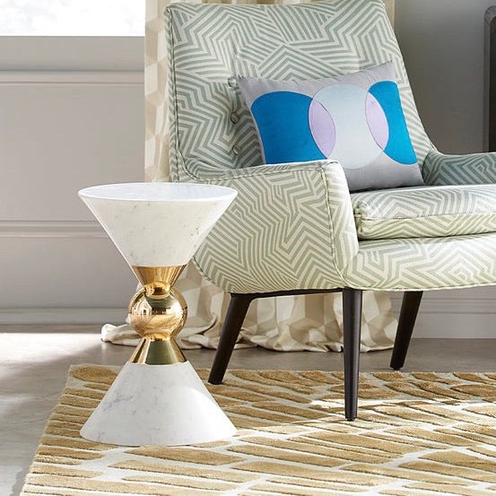 ベーシックな形状が巧みに組み合わせられたアウトラインのアクセントテーブル。無垢の大理石でできた二つの円錐の間に真鍮の球体をサンドイッチした幾何学的なデザインです。それぞれの素材の組み合わせはリッチで、シンプルながらもとても印象的、まさに究極のスモールテーブルです。