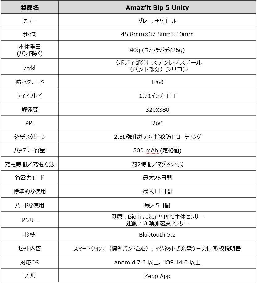 ・製品名:Amazfit Bip5 Unity(日本語読み:アマズフィット ビップファイブ ユニティー)