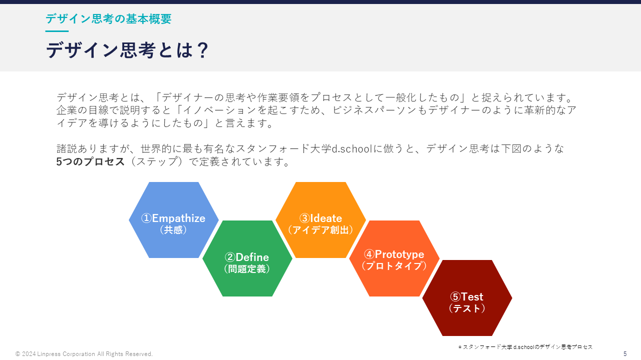 企業向けDX人材育成研修を提供する株式会社リンプレス(本社:東京都港区、代表取締役社長:三宮壮、以下、リンプレス)は、DXに取り組む企業様に向けて、『デザイン思考がDXの現場で重要視される理由』と題した資料を無料公開しましたので、お知らせします。