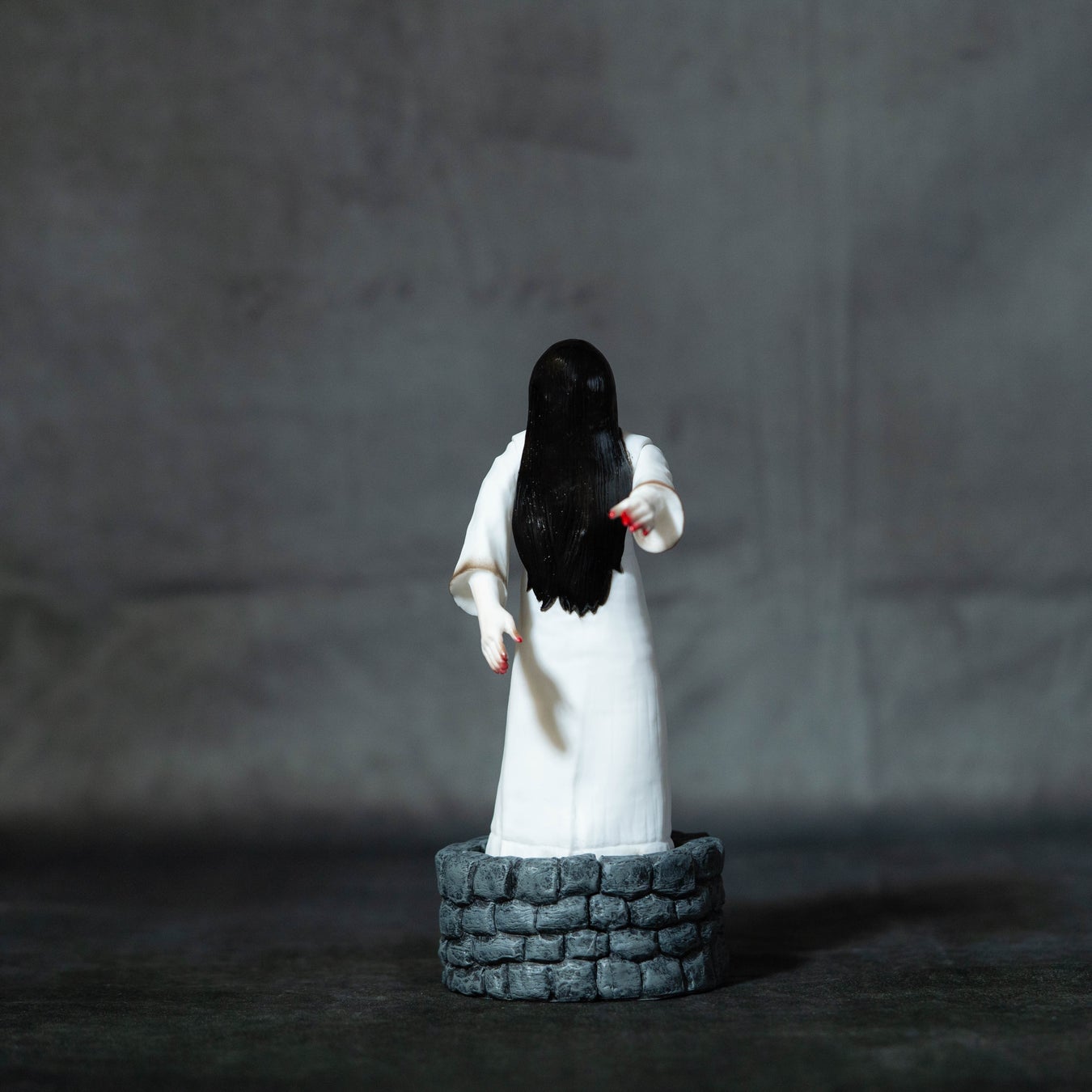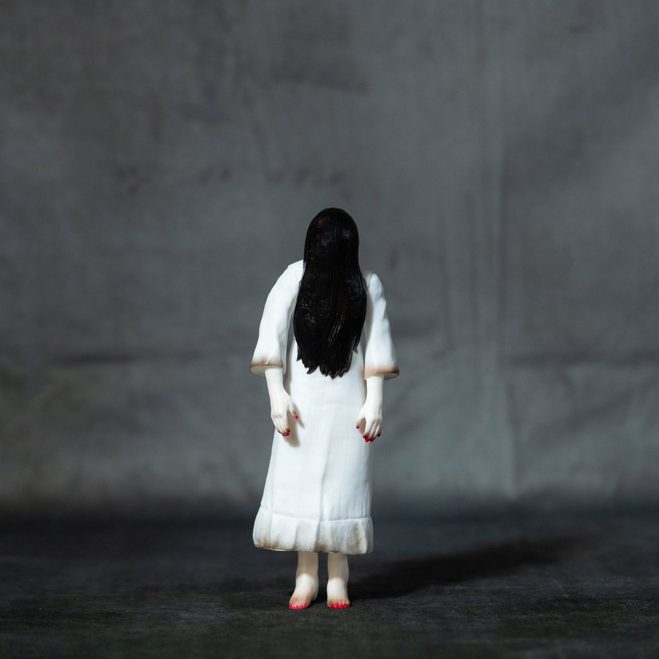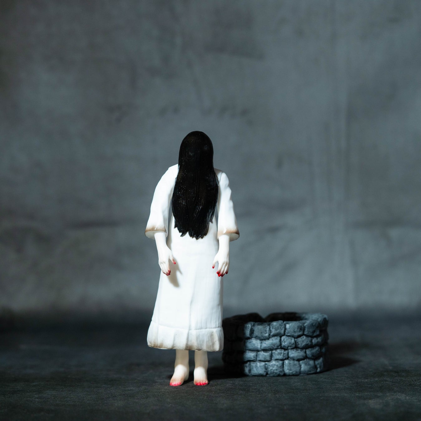白いワンピース姿に顔を覆い隠す長い黒髪が最大の特徴で、井戸やTV画面から出てくる姿で知られている。『リング』シリーズはハリウッドリメイクも果たし、いまや国内外で幅広い世代に高い認知度を誇る世界的ホラーアイコンとなった。