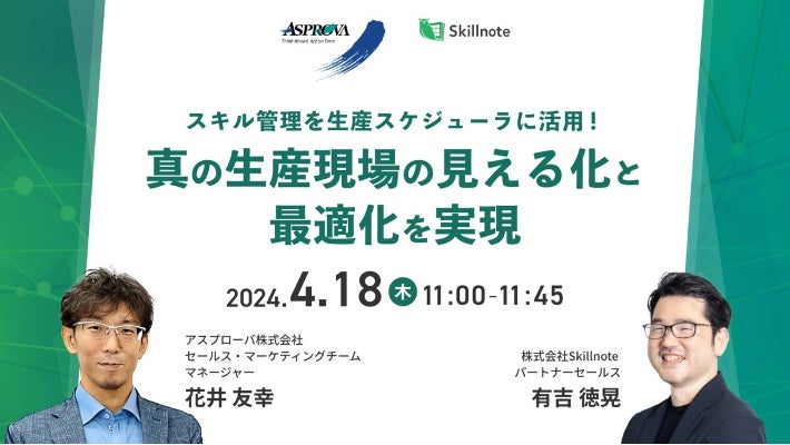 アスプローバ株式会社(本社:東京都品川区、取締役社長:田中 智宏、以下:アスプローバ)と株式会社Skillnote(本社 東京都千代田区、代表取締役 山川隆史、以下Skillnote)は、アスプローバが提供する生産スケジューラ「Asprova APS」とSkillnoteが提供するスキルマネジメントシステム「Skillnote」が4月16日より連携及び提供開始することをお知らせします。この連携を通じ、生産現場における従業員スキルを考慮した最適な計画立案と、生産計画から逆算した戦略的な人材育成を実現します。