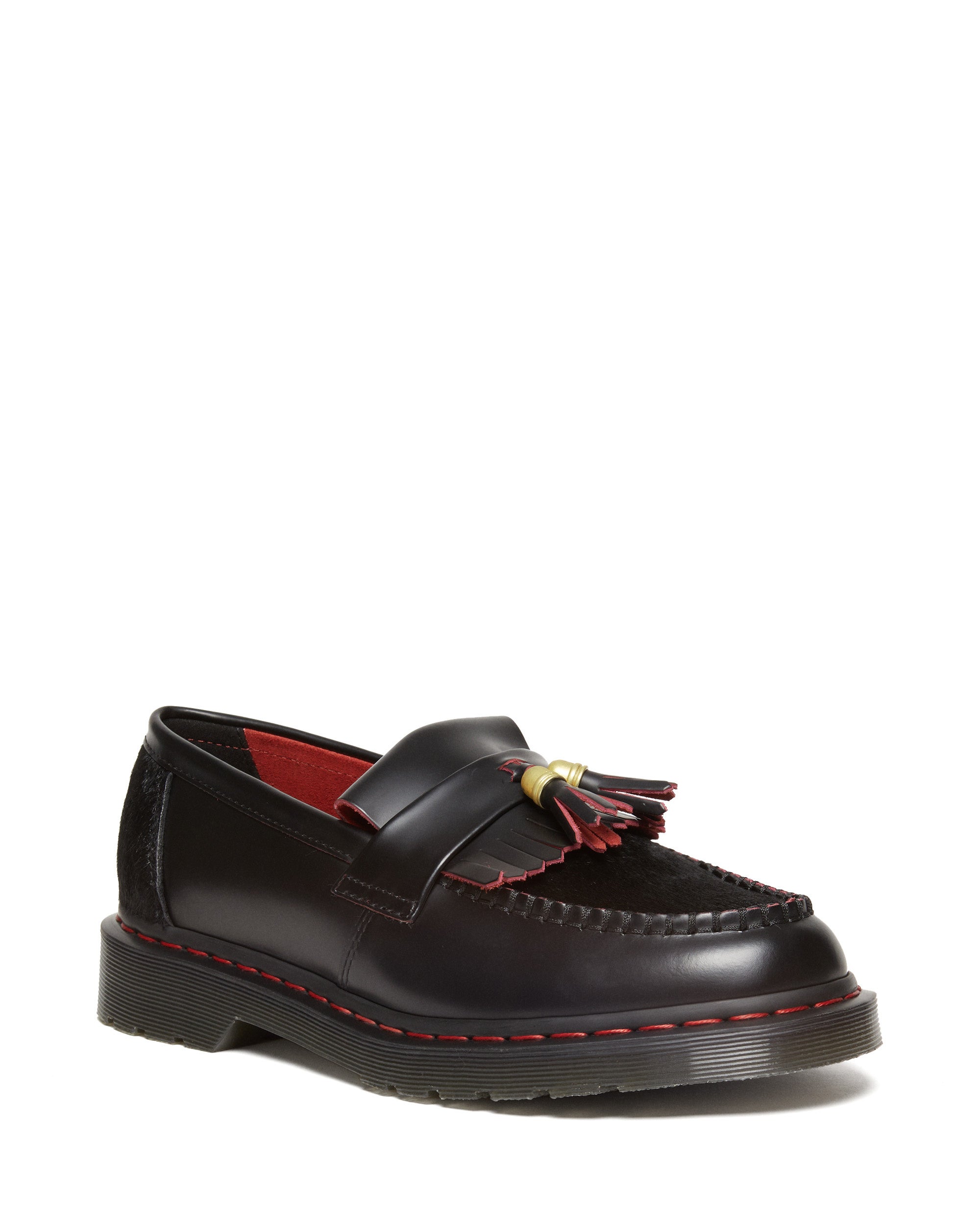 エイドリアン・ローファーは、スムース・スライス・レザーとアッパーとヒール部分のヘアオンレザーのコンビネーションが印象的なタッセルローファーです。ブラックの表革とレッドの裏革、コバ、インソールがアクセントを添えてスタイリッシュなムードを盛り上げます。タッセル部分にはゴールドの留め具をあしらい、高級感をプラスしています。ドクターマーチンのシグネチャーであるウェルトステッチは、こちらも「ラッキーレッド」仕様となっています。