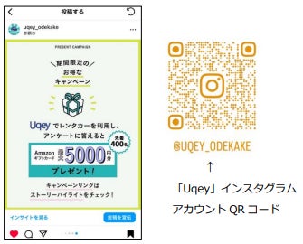 今なら「Uqey」でレンタカーを予約してご利用後にアンケートにご協力いただいたお客様には、先着400名様限定で「Amazonギフトカード」を進呈中です。詳しくはインスタグラムまたはキャンペーンページをご確認ください。
