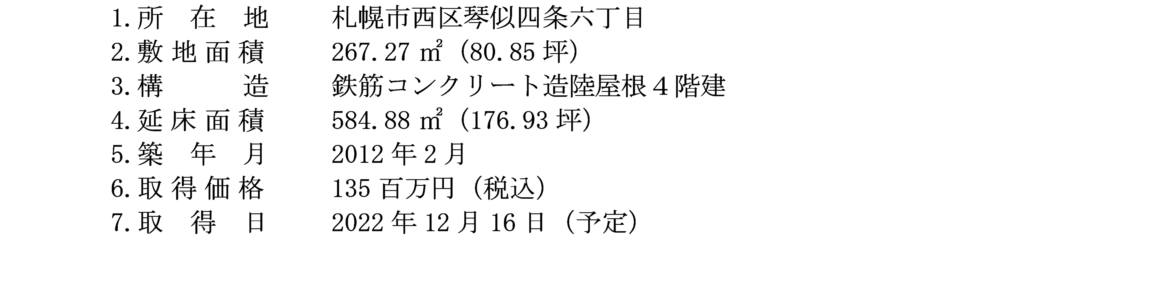 今般、10億円の家賃収入売上達成に向けて、2022年11月24日付で売主と売買契約を締結し、2022年12月16日(予定)付で、札幌市西区の賃貸マンション「K-MODE琴似」を取得することを決定いたしましたので、お知らせいたします。