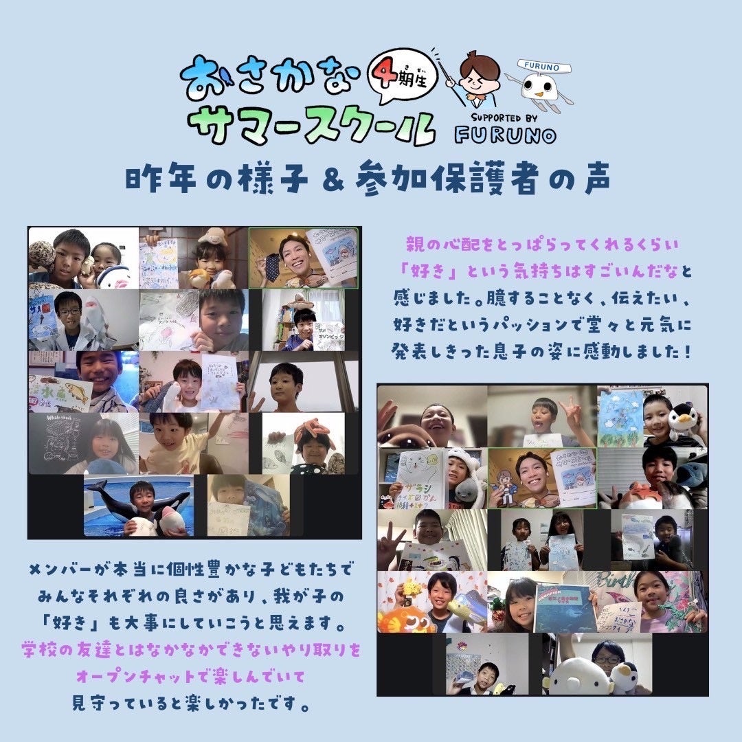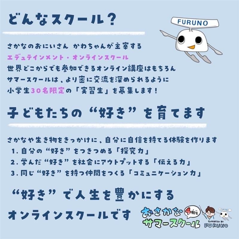 古野電気株式会社(本社:兵庫県西宮市、代表取締役社長執行役員:古野幸男、以下 当社)は「海を未来にプロジェクト」の一環として、さかなたちの“オモロい”生態や海の大切さを伝えることで子どもの好奇心を育てる活動を行っている「さかなのおにいさん かわちゃん」主催のオンラインスクールを2023年の開校時から支援しています。