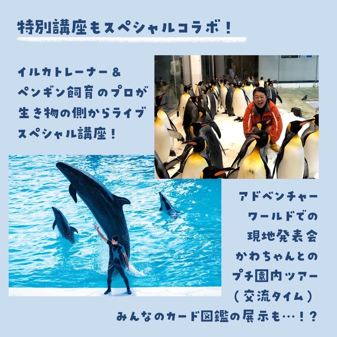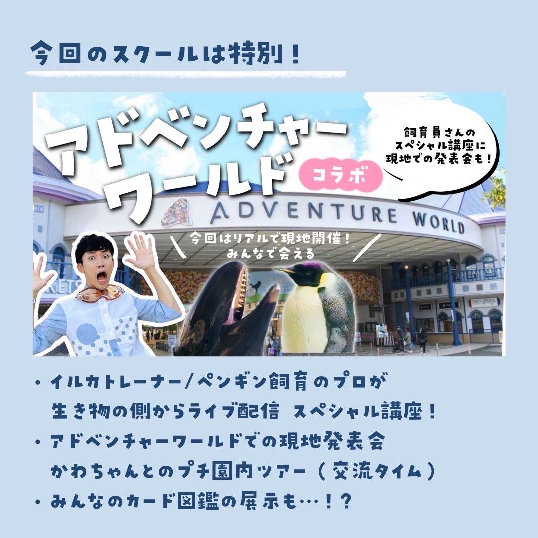 今回のスクールはアドベンチャーワールドともコラボレーションし、8月6日(水)の講座では同施設のイルカトレーナー&ペンギン飼育のプロフェッショナルによるスペシャルトークショーを開催する他、最終日の23日(土)には現地での特別講座と発表会を予定しています。