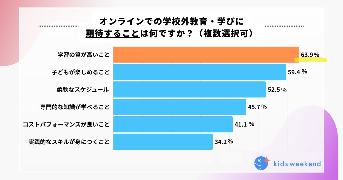 オンラインでの学校外教育・学びに対する期待として、「学習の質が高いこと」(63.9%) が最も多く挙げられました。次いで、「子どもが楽しめること」(59.4%)、「柔軟なスケジュール」(52.5%)が上位を占めています。これらの結果から、保護者は「質の高い学び」と「子どもが続けやすい環境」をオンライン学習に求めていることがわかります。