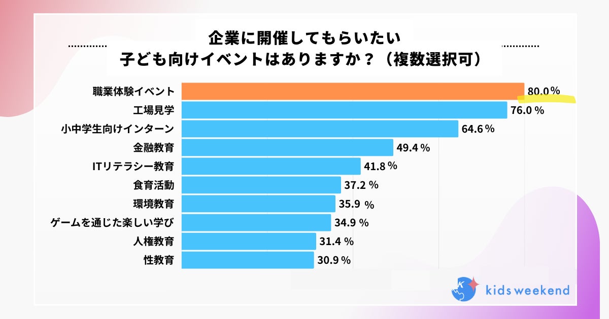 「職業体験イベント」(80.0%)や「小中学生向けインターン」(64.6%)が特に人気を集め、企業によるキャリア教育プログラムへの期待が高まっています。特に、実際の仕事を体験することは、子どもたちの将来の職業選択に大きく役立つと考えられています。