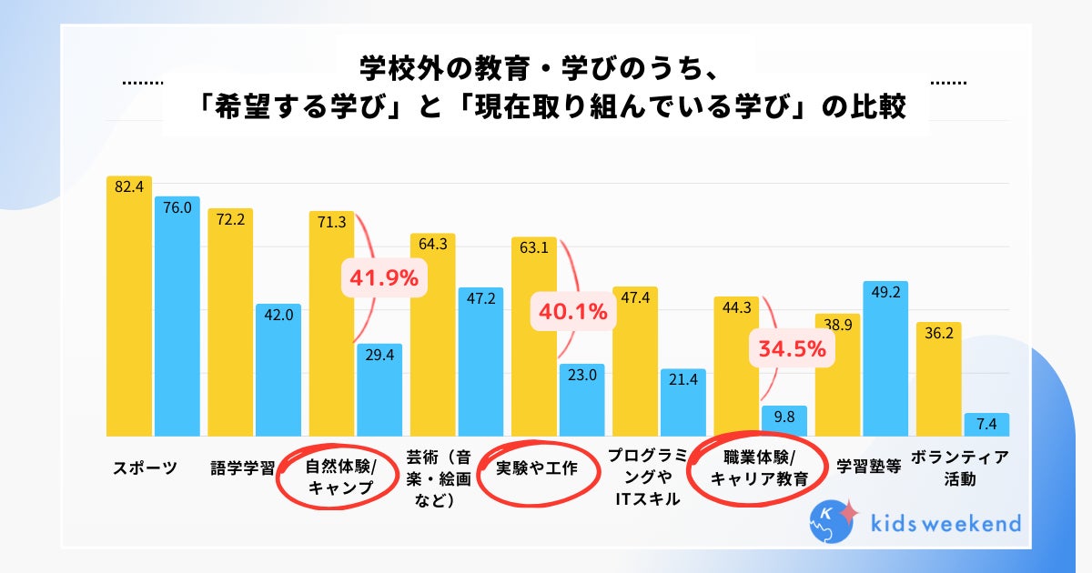 一方、保護者が希望する学びと実際に取り組んでいる学びを比較すると「自然体験やキャンプ(差分41.9%)」、「実験や工作(差分40.1%)」は、大きなギャップがあることが分かりました。特に「職業体験(差分34.5%)」は実際に取り組んでいる割合が低く、身近に取り組みにくい学びであることが推察されます。