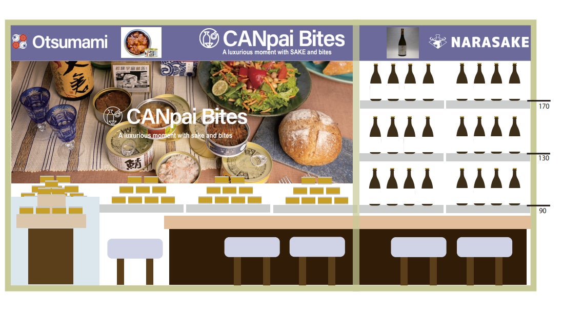 ブース名である「CANpai Bites」は、缶詰の「CAN」に、日本語の「乾杯」を掛け合わせ、軽くつまんで食べられるおつまみを意味する「Bite」を組み合わせています。