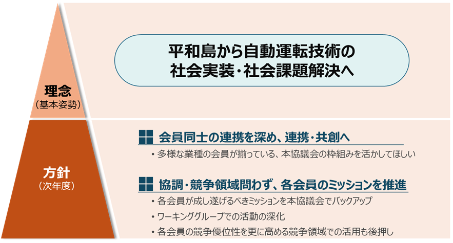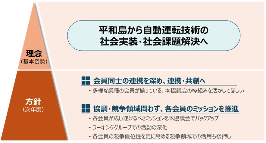 合計36社体制となる本協議会は、自動運転開発企業、通信、マップ、データセンター、物流事業者、商社、金融、保険、行政など多様な業種がそろうことで、実行力は一層強化されました。2026年度の運営方針として、WGをはじめとする会員同士の協調領域に加え、個社ごとの競争領域についても必要に応じて支援してまいります。また、官公庁・行政との連携をさらに進めながら、平和島を基点とした自動運転技術の社会実装に向けた検討を継続していく方針です。