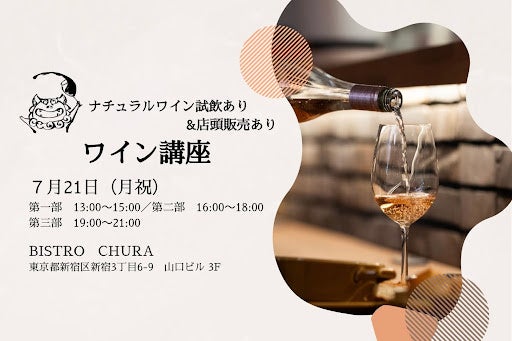 内容:ナチュラルワインを飲み比べしつつ学べる講義や、ビストロちゅらで提供しているナチュラルワインをワインを購入できる特別販売会等。