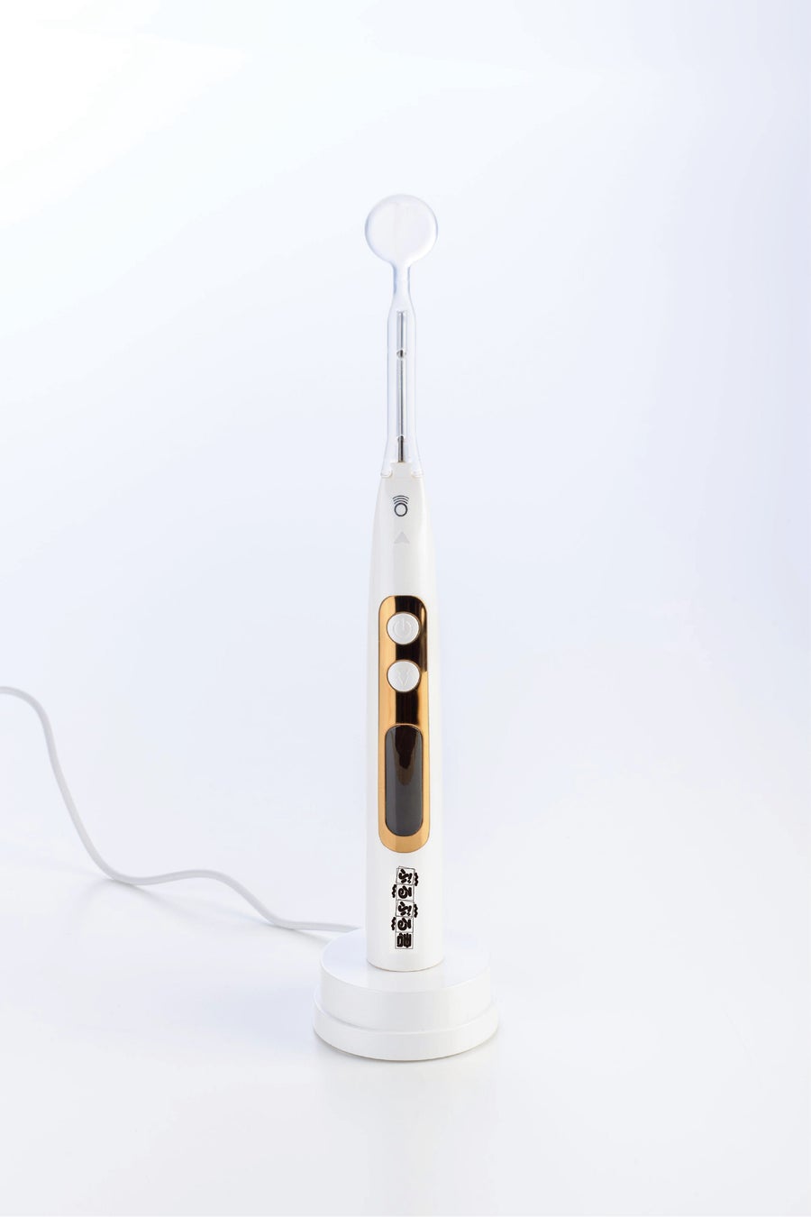 ①本機に歯鏡の形状をしたヘッドを下向きに装着して使用します。