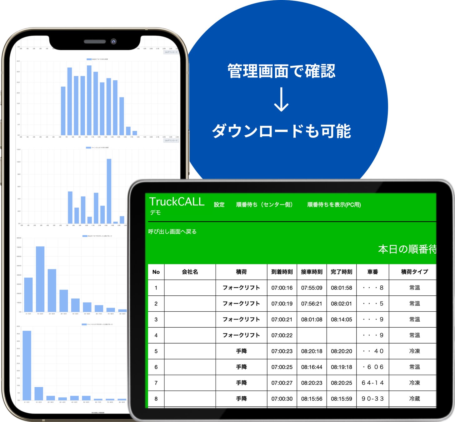 国土交通省から義務付けられている、荷待ち時間の記録データ化に対応しております。「KG TruckCALL」を導入すれば、荷待ちデータをExcel等に打ち込む必要なく、自動で集計できます。