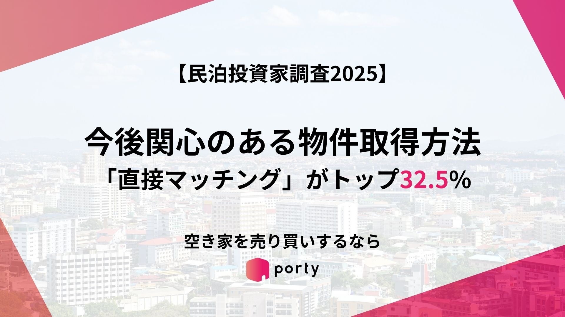 空き家マッチングアプリ「porty(ポルティ)」を運営する株式会社ポルティ(本社:神奈川県川崎市、代表取締役:平 瑶平)は、民泊投資家(1件以上の運営経験者)200名を対象に、今後さらに物件を取得する場合に最も関心のある取得方法について調査しました。