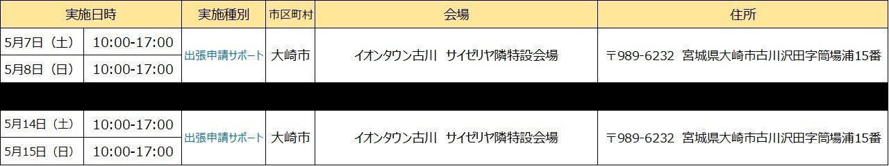 ※開催場所の調整状況や新型コロナウィルスの感染状況等により、「出張申請受付」及び「出張申請サポート」の開催を中止・延期、または実施内容が変更となる可能性がございます。