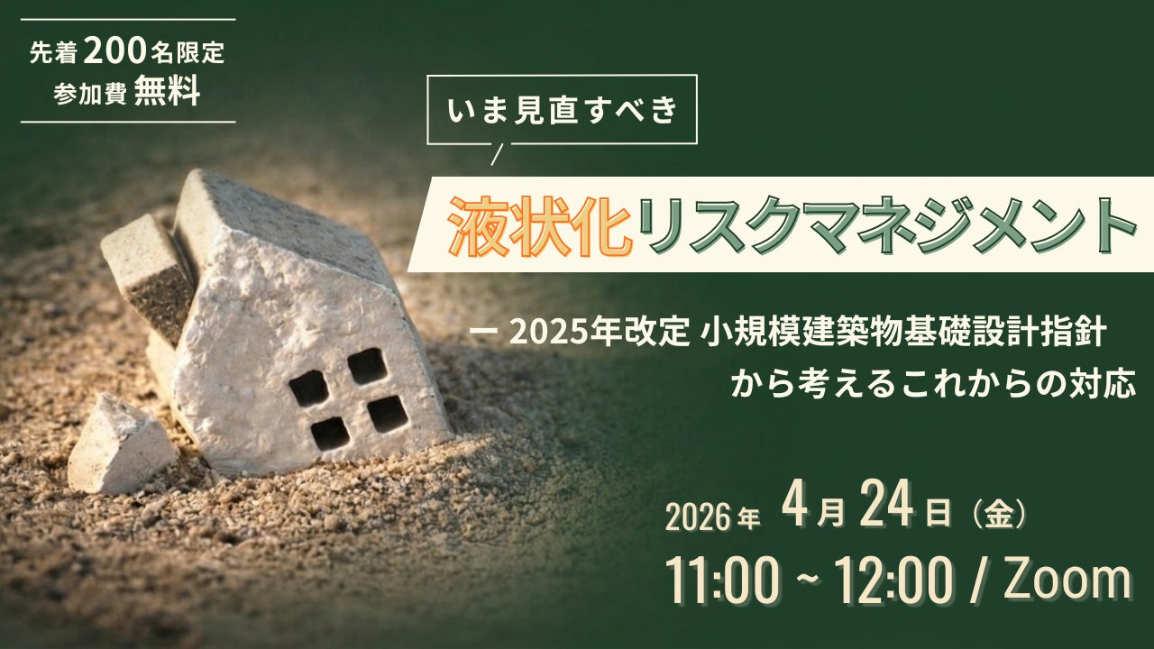 本ウェビナーでは、指針改定の背景と要点を整理するとともに、宅地の液状化被害を例に、液状化リスクの評価方法や建築主への伝え方をわかりやすく解説します。
