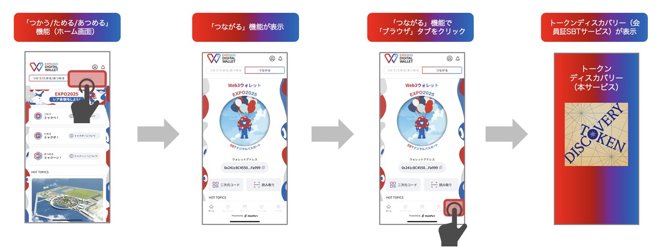 「トークンディスカバリープログラム」は、「EXPO 2025 デジタルウォレット」の事業連携サービス(SBTデジタルパスポート)のバージョンアップ機能として、「つながる」から、右下のブラウザタブをクリックすることで直接起動して利用できるWeb3の技術を活用した会員証サービスです。