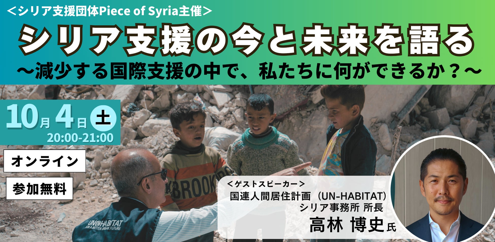 青山先生の解説、そして、複雑な中東・シリア情勢の中で活動をしてきたPiece of Syriaの活動の今までとこれからもお伝えしながら、平和のために、私たちができることをともに考えます。